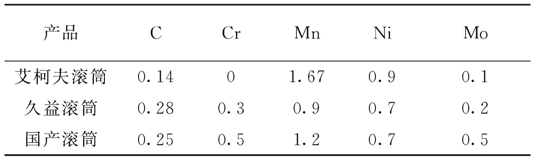 产品CCrMnNiMo艾柯夫滚筒0.1401.670.90.1久益滚筒0.280.30.90.70.2国产滚筒0.250.51.20.70.5