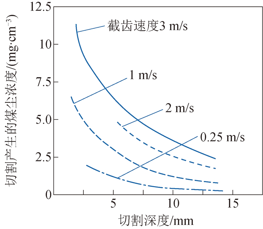 减少落煤二次破碎是降低综采工作面粉尘量的有效方法,因此改进采煤机结构或改变截割工艺是重要的防尘措施。美国学者研究发现,滚筒截齿的前角、后角和刃角对煤尘产生强度有很大影响,提高牵引速度可以降低煤尘产生强度,由此建议截齿的间隔角为5°,截齿最佳倾角为30°,截齿切割速度小于3.5 m/s。如果滚筒螺线间距比截深大一倍,截齿数减少20%~30%,可显著降低含尘量。美国煤矿试验证明,加大采煤机截割深度和降低滚筒转速有利于减少粉尘产生量,采煤机滚筒转速从70 r/min降到35 r/min,并使截深增大1倍,粉尘产生量可减少60%,切割深度和截齿速度对粉尘量的影响如图19所示[46-47]。