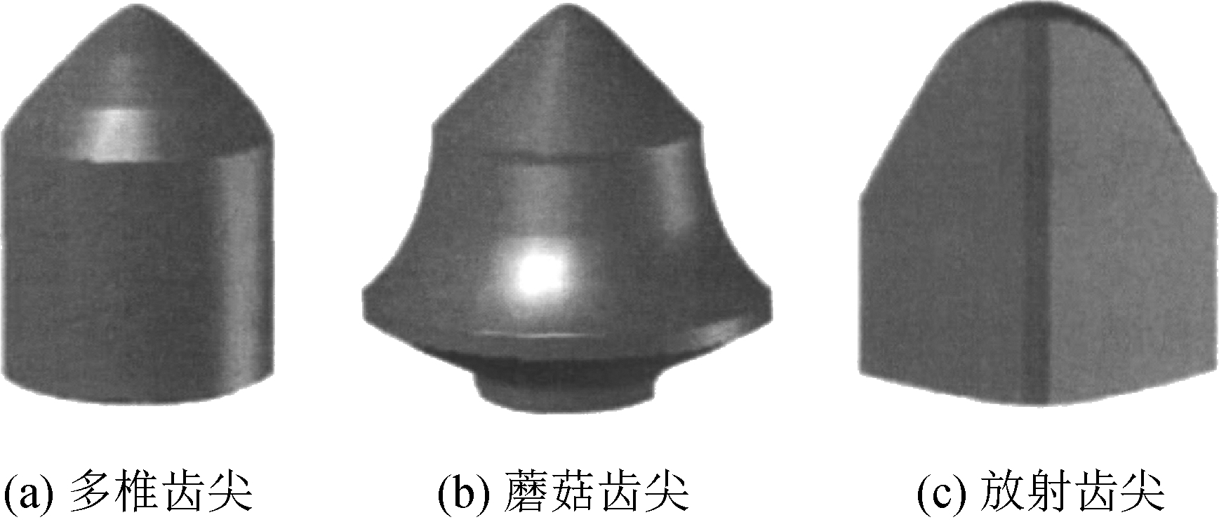1951年,我国生产出凿岩机的硬质合金钎头。20世纪60年代后期,我国开发出硬质合金柱形齿尖。采煤机的硬质合金齿尖主要型式分为多锥齿、蘑菇齿及放射齿,如图15所示[16],多锥齿尖主要适用于截割硬煤层、中等冲击功的截齿;蘑菇齿有利于提高强度和抗剪切力,适用于截割软到中硬煤层;放射齿可用于不旋转的截齿,每个合金齿的面被设计成一个特定角度。