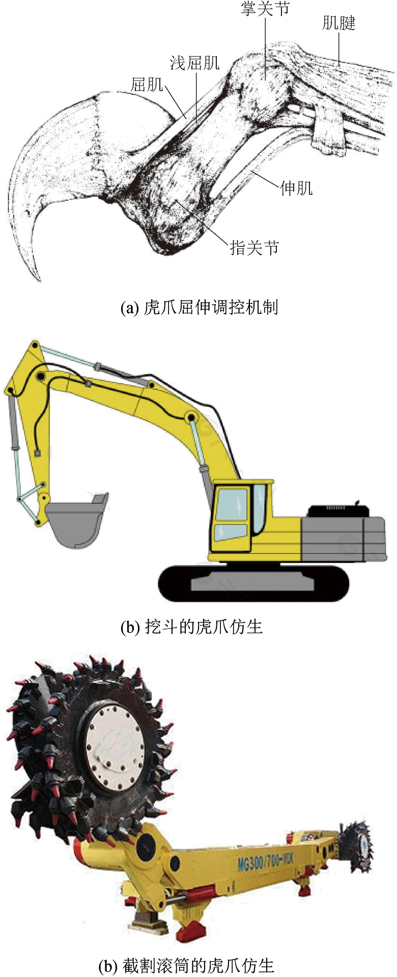 老虎的杀伤力除了源自其强大爆发力和快速攻击力,还要依靠其精良武器,即锋利的牙齿和可伸缩的尖爪。虎爪的肌腱调控机制如图24(a)所示,在伸肌和屈肌配合控制下,尖爪可以自由伸缩。在行走或奔跑时,尖爪能屈缩到骨质爪鞘中,避免磨损,形成更大的接触面积。在捕猎食物时,尖爪伸展出来,锋利的虎爪在老虎前肢极强的掌力挥动下,对猎物产生致命的袭击。这种机构在挖掘机设计中得到充分运用,如同虎爪的挖斗能够实现灵活的控制。但在采煤机截割机构中尚未得到充分体现,截齿的旋转截割模仿了虎爪的扑杀运动,而截齿的爆发冲击力发挥的不充分。此外,老虎在扑杀过程中,虎爪产生向外的撕裂作用力,使撕碎食物更加高效,这是采煤机截割机构需要仿生的关键点,若截齿具备这种能力,就能利用脆性煤层抗拉强度弱的特点,产生刺入煤层冲击破碎与撕扯煤层裂碎的联合落煤效果,使煤层截割更加高效节能。