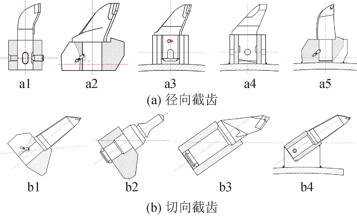 采煤机截齿一般分为刀形截齿和镐形截齿,如图11所示。镐形截齿以齿尖撞击煤体而产生挤压力,使煤体沿着齿尖周边的弱强度面自由碎落。刀形截齿产生剪切力,刀刃冲击煤体时,剪切作用使煤层强制破落,落煤块度大小取决于截齿的前刃面的面积和切削厚度。根据安装位置不同,它们又分为径向截齿和切向截齿,其差别是截齿轴线与滚筒半径方向的夹角不同。齿柄轴线沿滚筒半径方向的截齿称为径向截齿,齿柄轴线与滚筒半径成一定夹角的截齿称为切向截齿。