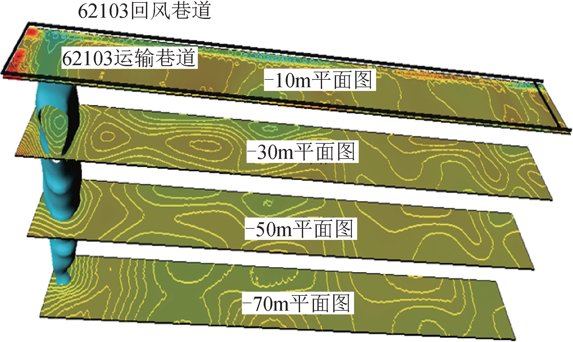 图6 不同情况下对构造的槽波探测 图6(a)为陕西彬长矿区高家堡煤矿41103工作面巷道掘进过程中,利用已掘进巷道探测掘进头前方断层,探测距离达到了200 m;图6(b)为阳泉煤业二矿81101工作面巷道形成后,在巷道的两帮布置测线,探测煤层内断层,探测深度达到了300 m;图6(c)为皖北刘桥一矿417工作面形成后,在上下巷布置测线探测工作面内部断层,可探测落差>1/2煤厚的小型断层。 2.3.3 三维音频电透视 三维音频电透视技术是在传统的音频电透视基础上,改进了施工工艺和数据处理方法,将原有的二维CT成像升级为三维反演成像,得到的地质情况解释成果更加准确,与实际情况更贴近。可以根据实际需要对不同层位进行切片,实现了工作面顶底板100 m深度范围内水害隐患精细探测。 图7是淮南西部公司唐家会煤矿62103工作面采用三维音频电透视对工作面内部陷落柱的探测成果,从不同层位的切面图可以准确判定陷落柱的位置和大小。