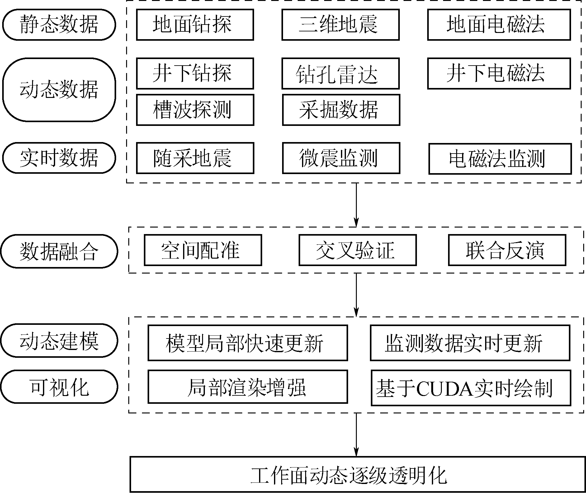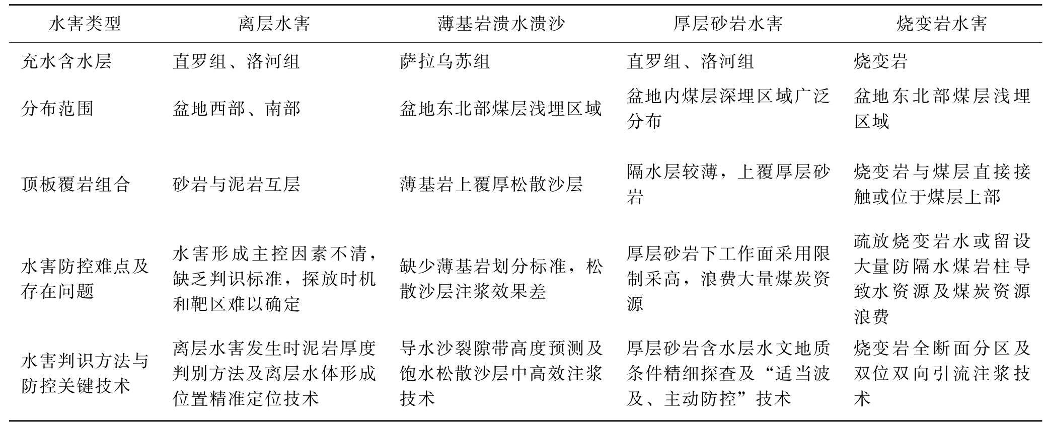图1 透明工作面动态建模流程 利用工作面回采过程中揭露的资料、随采监测数据、采煤设备实时数据等信息对工作面地质模型进行动态修正。结合透明工作面模型,进行“数字化采煤”模拟,提前规划采煤机的预想截割曲线,变“记忆截割”为“预想截割”,通过同步映射技术与虚拟现实技术将井下实时信息传输到地面控制中心,实现地面人员对工作面采煤活动的远程操控、井下智能化无人开采。 2.2 煤矿防治水技术2.2.1 鄂尔多斯盆地侏罗纪煤田顶板水害防治理论与技术 鄂尔多斯盆地是我国重要的含煤盆地,侏罗纪煤炭资源储量占全国的31.9%,我国批准建设的14个亿吨级大型煤炭生产基地中,神东、陕北、黄陇及宁东4个基地主采盆地内的侏罗纪煤炭资源[5]。由于侏罗纪煤田浅部煤层上覆基岩孔隙裂隙含水层和松散含水层,加之侏罗纪煤炭资源开采条件好,大尺度机械化工作面开采对上覆含水层扰动较大,因此,顶板水害严重影响和威胁着侏罗纪煤炭资源的安全生产。 为了保障侏罗纪煤炭资源开发的安全,西安研究院联合国家能源集团、中国中煤能源集团、陕煤集团等大型煤企,针对鄂尔多斯盆地侏罗纪煤田顶板水害形成机理、致灾判别标准、精准防控技术等方面,开展了跨区域、长周期、多学科产学研用协同科技攻关,形成了典型顶板水害防控技术体系,保障了鄂尔多斯盆地侏罗纪煤田千万吨矿井群的安全生产和我国西部煤炭工业的快速发展[6]。鄂尔多斯盆地典型顶板水害特征及防控关键技术见表1。 表1 鄂尔多斯盆地典型顶板水害特征及防控关键技术