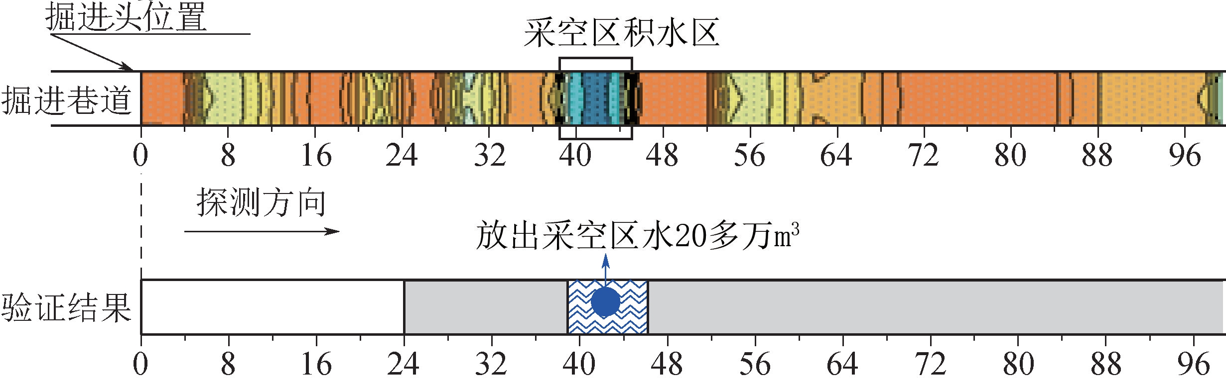 图4 扎尼河露天矿截水帷幕平面图 2.3.1 直流电法 为了避免巷道掘进过程中水害事故的发生,发明了适用于煤矿巷道内顺层超前探测含水构造的直流电法技术,研发了YD32(A)型防爆高分辨数字直流电法仪及配套处理解释系统,有效消除了巷道顶底板及后方异常体的影响,提高了掘进巷道前方地质异常体的探测能力,超前探测距离提高到80 m,距离误差小于5%,解决了掘进巷道前方采空区积水、含(导)水构造的精细探测难题。 图5是煤矿井下直流电法探测的结果及现场验证情况,通过直流电法探测到掘进巷道前方40~45 m处存在富水异常区,通过钻探验证,证明了富水异常区为老窑积水区,共疏放老窑积水超过20万m3,成功避免了掘进巷道突水事故的发生。 2.3.2 槽波地震 槽波地震勘探技术是在煤层中激发、传播和接收弹性波的一种物探技术。该技术不受煤矿井下铁磁物质的影响,具有传播距离大、探测精度高等特点,主要用于工作面形成后,探测工作面内部小断层、陷落柱、煤层冲刷带、突出危险区等,现已拓展应用于巷道掘进超前探测、单条巷道形成后巷道侧帮探测等方面。目前,井下槽波地震探测的距离超过1800 m,可以查明直径10 m以上的陷落柱、落差大于1/2煤厚的断层、圈定煤层变薄区的范围等[13]。