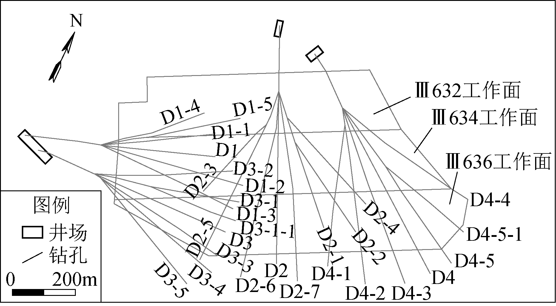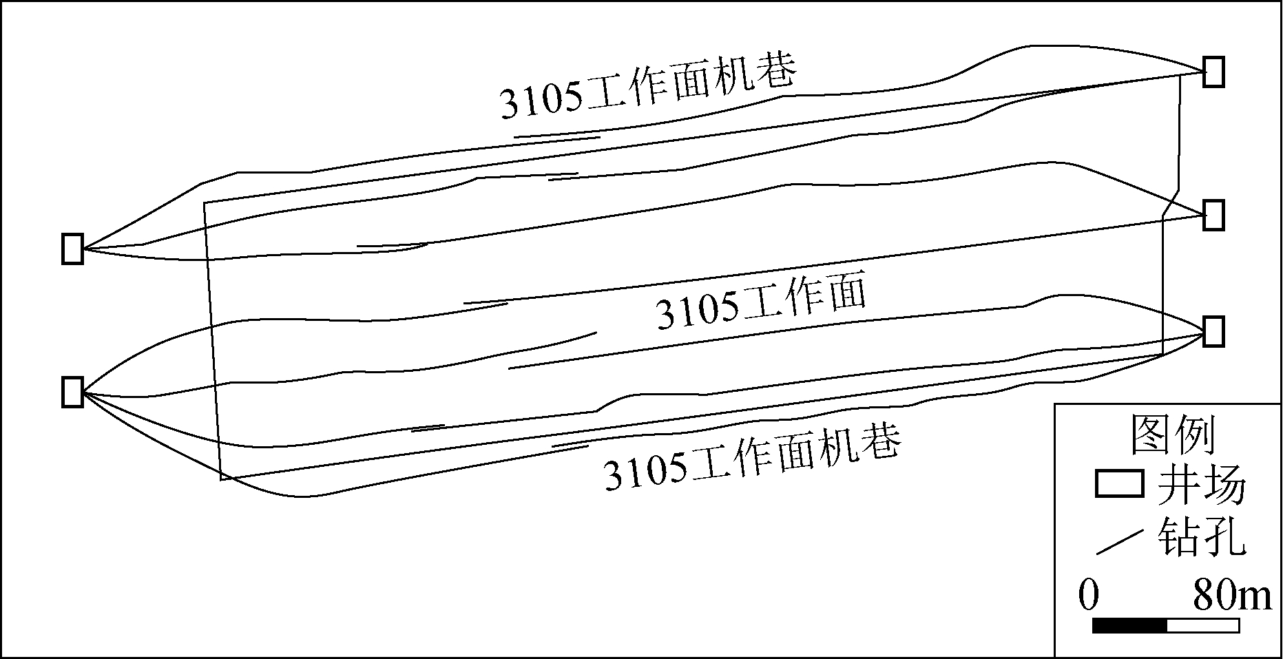 图2 朱仙庄煤矿Ⅲ634/6工作面地面区域治理平面图 图2是淮北朱仙庄煤矿Ⅲ634/6工作面地面区域治理工程平面图,在地面共布置扇形定向水平主孔4个,21个分支孔,孔间距为60 m,选取与6号煤层间距74~80 m发育较为稳定的“三灰”(太原群三号灰岩)作为目标治理层,注浆改造“三灰”的同时,也阻隔了其下部含水层的导水构造。通过地面区域治理,已完成了8个工作面底板灰岩水害防控,解放储量约600万t[9]。 图3是桑树坪煤矿3105工作面井下区域治理工程平面图,在井下共布置钻场5个,14个梳状分支孔,孔间距约40 m,垂直深度位于奥灰顶面以下15~20 m,对于揭露的奥灰含水层出水位置采用下行式注浆。目前,3105工作面已经安全回采完毕[10]。