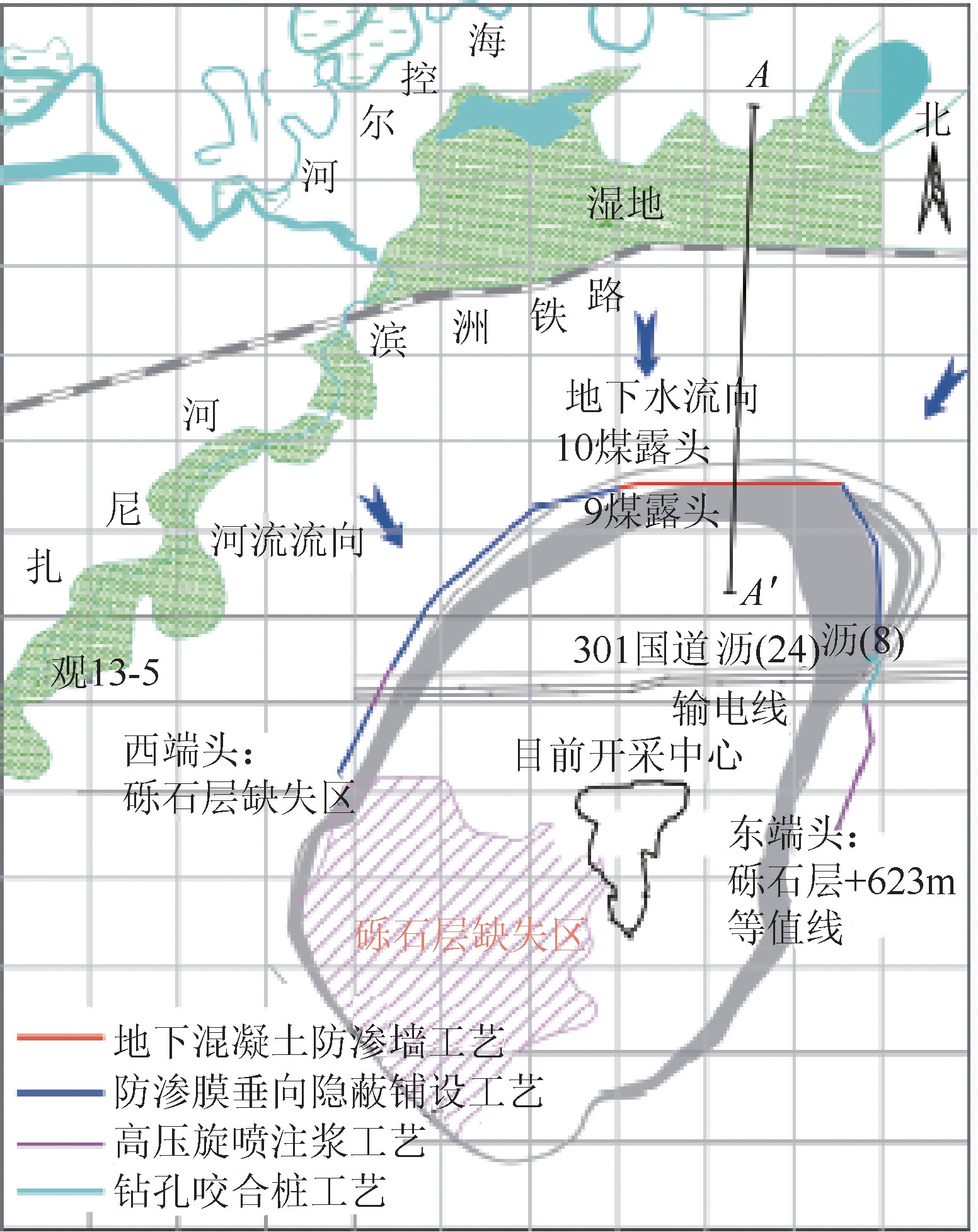 图3 桑树坪煤矿3105工作面井下区域治理平面图 2.2.3 露天矿大型帷幕截渗减排技术 东部草原区大型煤电基地位于内蒙古东部,是我国重要的能源保障基地,产能超过4亿t,占东北区产能的57%,区域能源供应和生态功能十分重要。露天矿在剥离、开采过程中,对区域内浅部含水层及周边生态环境造成了严重的破坏,不仅造成地下水疏干、河流流量减少、植被退化等后果,同时大量的矿坑排水还会给煤炭企业带来巨额的生产成本。 为了解决露天矿排水量大及保护周边生态环境的问题,扎尼河露天矿采用地下混凝土防渗墙、防渗膜大深度垂向铺设、高压旋喷注浆、钻孔咬合桩等工艺,在矿坑与周边地表水系之间建造了长度近6000 m,最大深度超过50 m,厚度大于0.6 m的截水帷幕,如图4所示。帷幕工程实施后,内外含水层水位最大差值超过10 m,矿坑排水量减少60%以上,实现了露天矿的绿色开采[11]。 2.3 地球物理勘探技术与装备地球物理勘探技术(以下简称“物探技术”)具有非接触、无损探测、成本低、速度快、覆盖面广等优势,在煤矿地质勘探与灾害防治等方面得到了广泛应用[12]。地面物探技术主要包括二维/三维地震勘探、瞬变电磁法、高密度电法、直流电法、可控音频大地电磁测深、地质雷达、瑞雷波、孔间透视等;井下物探技术主要包括无线电波透视、瞬变电磁法、直流电法、高密度电法、地质雷达、音频电透视、槽波地震、反射地震、瑞雷波等。物探技术在资源勘探、矿井设计、采区划分、工作面优化前的地质和水文地质条件探查中应用广泛。通过长期实践,围绕物探技术总结出“电法超前探测、槽波扫面、音频电透探底”综合物探工作流程。近些年来,西安研究院在直流电法、槽波地震和音频电透视等方面研究成果显著。