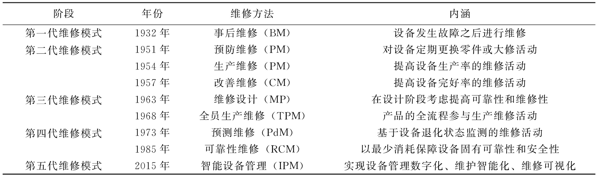 阶段年份维修方法内涵第一代维修模式1932年事后维修(BM)设备发生故障之后进行维修第二代维修模式1951年预防维修(PM)对设备定期更换零件或大修活动1954年生产维修(PM)提高设备生产率的维修活动1957年改善维修(CM)提高设备完好率的维修活动第三代维修模式1963年维修设计(MP)在设计阶段考虑提高可靠性和维修性1968年全员生产维修(TPM)产品的全流程参与生产维修活动第四代维修模式1973年预测维修(PdM)基于设备退化状态监测的维修活动1985年可靠性维修(RCM)以最少消耗保障设备固有可靠性和安全性第五代维修模式2015年智能设备管理(IPM)实现设备管理数字化、维护智能化、维修可视化