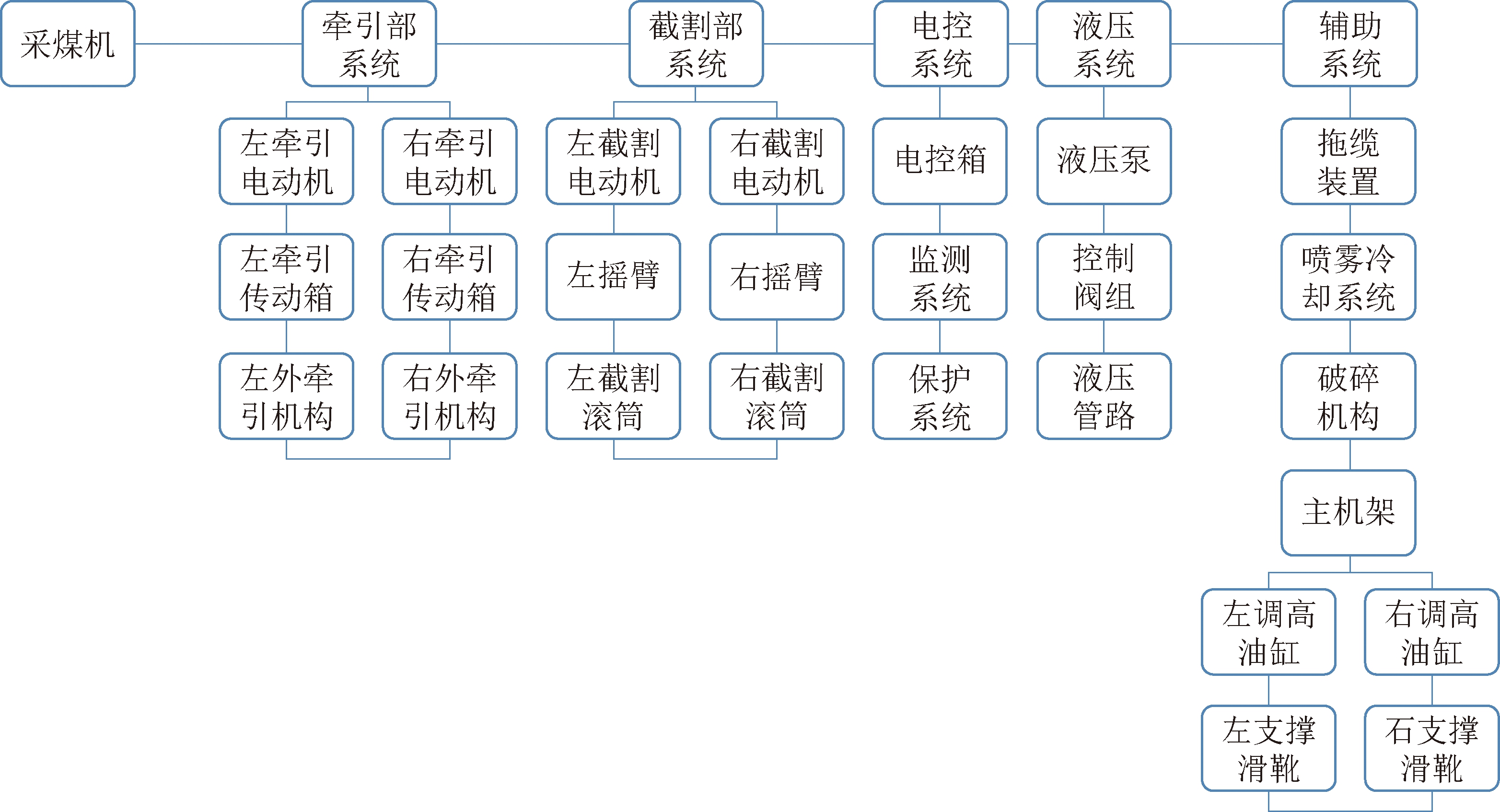 采煤机可靠性架构如图1所示,主要包括牵引部、截割部、电控、液压、辅助5个子系统,它们组成一个复杂的串并联可靠性模型,在系统中包含26个主要部件。统计数据表明,大部分机械设备的无故障工作时间及故障时间服从负指数分布,可用马尔可夫过程来分析采煤机的可靠性指标[5]。