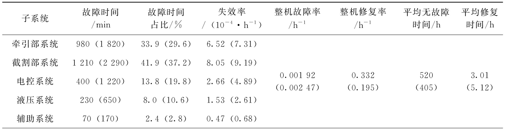 子系统故障时间/min故障时间占比/%失效率/(10-4·h-1)整机故障率/h-1整机修复率/h-1平均无故障时间/h平均修复时间/h牵引部系统980(1 820)33.9(29.6)6.52(7.31)截割部系统1 210(2 290)41.9(37.2)8.05(9.19)电控系统400(1 220)13.8(19.8)2.66(4.89)液压系统230(650)8.0(10.6)1.53(2.61)辅助系统70(170)2.4(2.8)0.47(0.68)0.001 92(0.002 47)0.332(0.195)520(405)3.01(5.12)