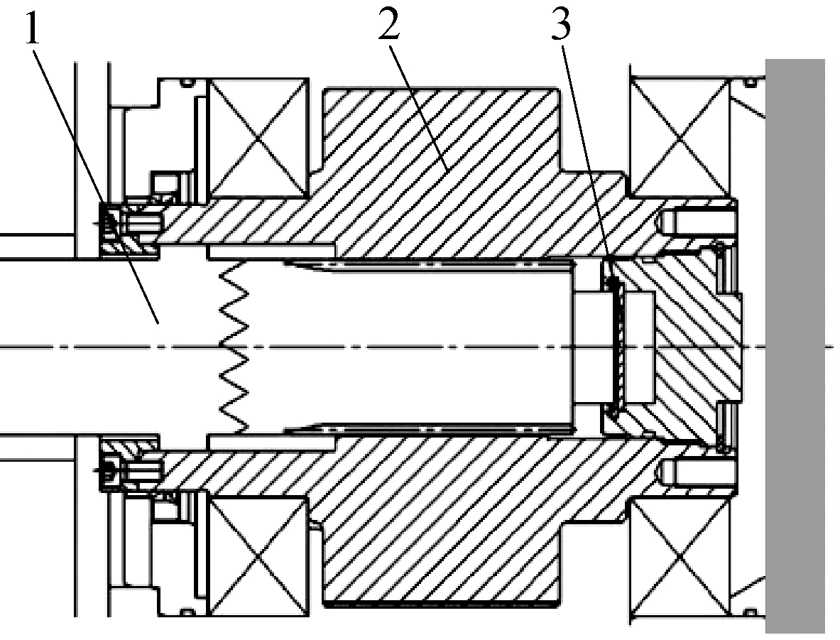 1965年,安德森公司的MK-Ⅱ型双滚筒采煤机上装有牵引力过载保护的摩擦限矩器,正常工作时,摩擦限矩器处于闭合状态;当牵引力过载(>20 t)时,限矩器的摩擦片打滑,起到过载停车的保护作用。1975年,久益公司的1LS型采煤机在截割电机传动轴上设计了空心扭矩轴保护装置,如图6所示,当截割硬岩或滚筒卡住发生过载时,空心轴内部的小直径传动轴被扭断,保护传动件和电机不发生破坏[48]。1990年,久益公司生产的6LS采煤机上装有5根扭矩轴,对采煤机截割部起到了有效的缓冲减振和过载保护作用[49]。1994年,艾柯夫公司的SL500采煤机上装设了弹性扭矩轴,之后的SL系列采煤机使用扭矩轴作为过载保护装置。2016年,三一重工集团在其采煤机上设计了端齿联轴器,如图7所示,利用端齿盘在传递扭矩时的齿间作用力产生轴向分力的特性,过载时会推动传动轴分离端齿盘,从而断开过载冲击传动链,避免了更换扭矩轴,减少了停产时间[50]。