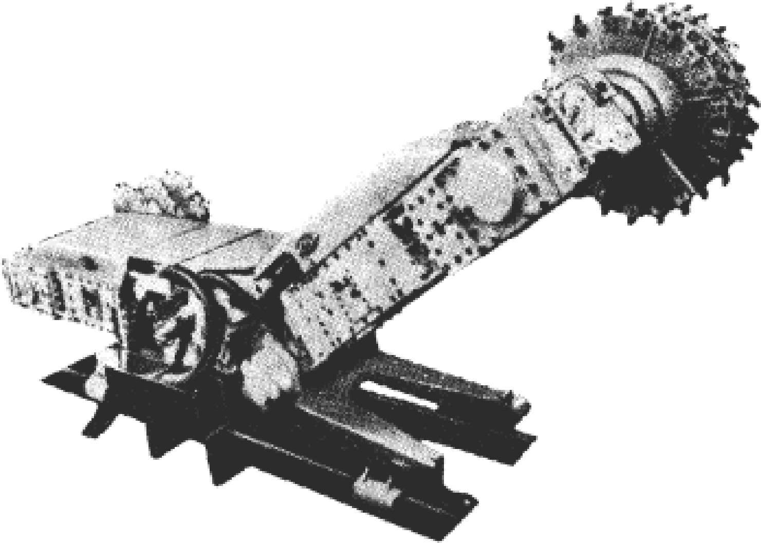 (2)重叠式布置。1971年,法国沙吉姆公司制造出DTS-300型双滚筒采煤机,这种采煤机没有专门的摇臂,电机、减速箱和滚筒连为一体,牵引部与截割部重叠布置,靠液压装置驱动一同升降提高,使采煤机机身大为缩短,如图4所示。1986年,英国杰弗里·戴蒙德(BJD)公司生产的ACE紧凑型采煤机、1987年西安煤矿机械厂生产的MXP240型采煤机也是这种布局形式。