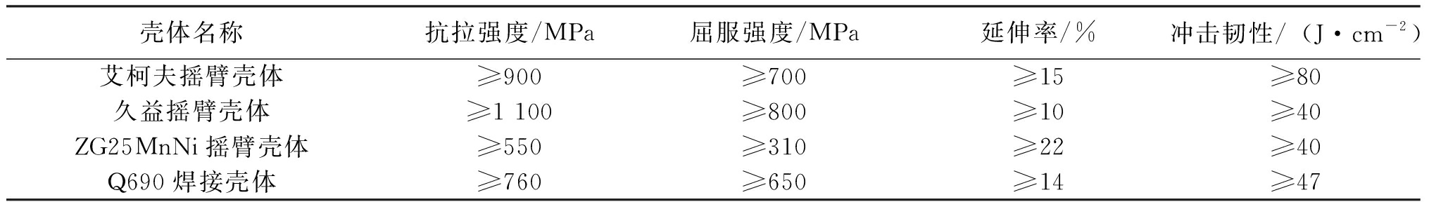 据统计,50%以上的采煤机摇臂故障是壳体强度不足和变形引起的,因此必须提高摇臂壳体材料强度及可靠性。德国艾柯夫公司制造的SL500采煤机摇臂壳体材料是GS-22Mo4铸钢。国内采煤机的摇臂壳体材料主要是ZG270-500、ZG25Mn或ZG25MnNi碳素钢或合金钢,屈服强度和抗拉强度难以满足大功率采煤机高强度摇臂要求。近年来,国内陆续开发了高强度摇臂壳体新钢材。2009年,三一重装集团的采煤机以ZG25Mn2-Ⅱ合金钢铸造摇臂壳体,元素含量占比为C 0.270%~0.340%,Si 0.300%~0.500%,Mn 1.200%~1.500%,S<0.300%,P<0.035%,Cr<0.035%,布氏硬度达到177 HBW。2013年,天地科技股份公司上海分公司生产的MG750/1800-WD型采煤机铸造摇臂材料是ZG25SiMn2Mo,2007年出产的MG500-1180-WD系列采煤机摇臂材质为ZG310-570,抗拉强度