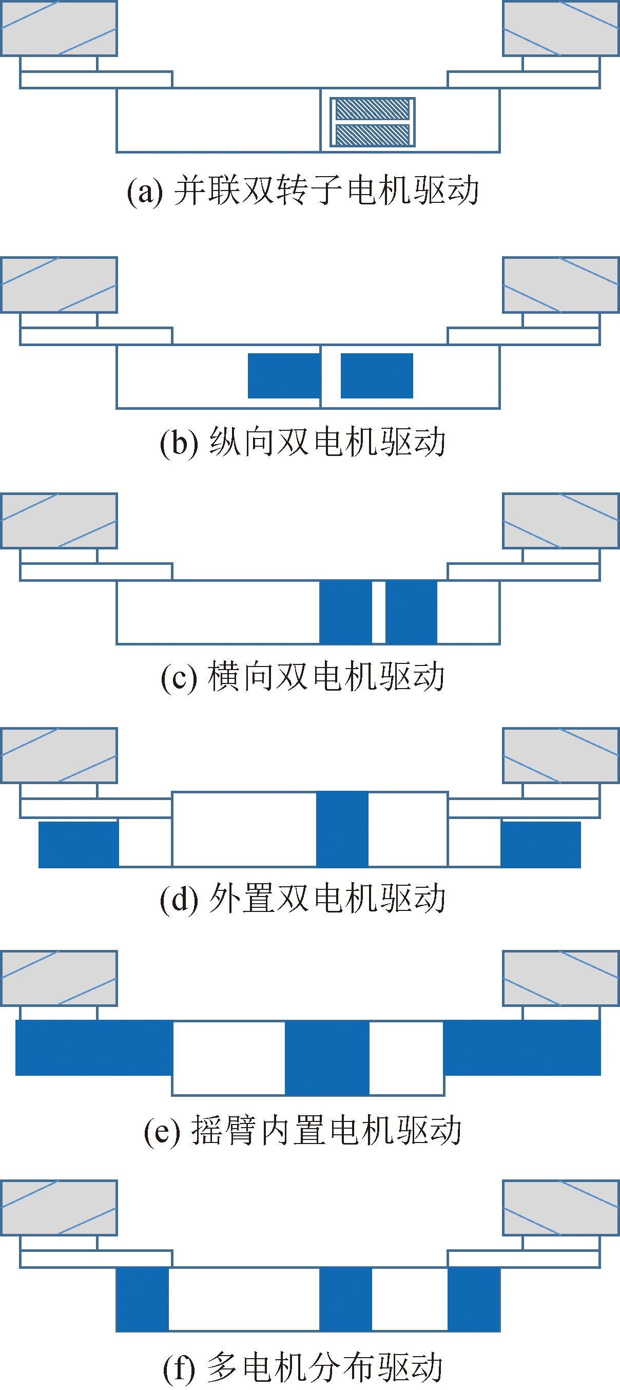 自采煤机诞生之后,很长时间都是采用单电机串联驱动截割部和牵引部,随着采煤机功率和生产能力不断增大,这种单驱动存在的可靠性弱点日益明显。自20世纪70年代中期,国内外出现了多电机驱动的采煤机,体现了电动机冗余驱动的可靠性理念,使采煤机结构布局灵活,可靠性和适应性显著增强,为大功率采煤机研发开辟了新的途径。采煤机的多电机驱动主要有6种形式[17],如图5所示。