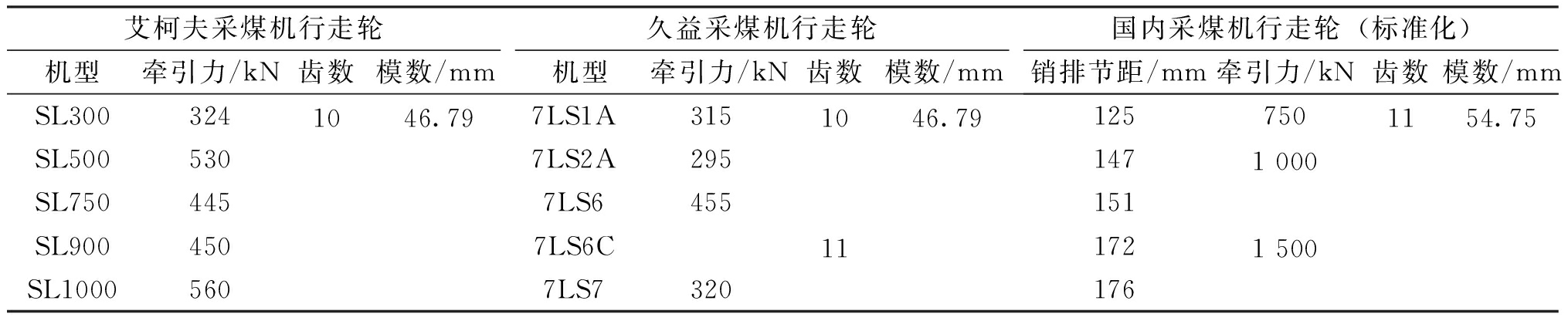 艾柯夫采煤机行走轮机型牵引力/kN齿数模数/mm久益采煤机行走轮机型牵引力/kN齿数模数/mm国内采煤机行走轮(标准化)销排节距/mm牵引力/kN齿数模数/mmSL300324SL500530SL750445SL900450SL10005601046.797LS1A3157LS2A2957LS64557LS6C7LS7320101146.791251471511721767501 0001 5001154.75