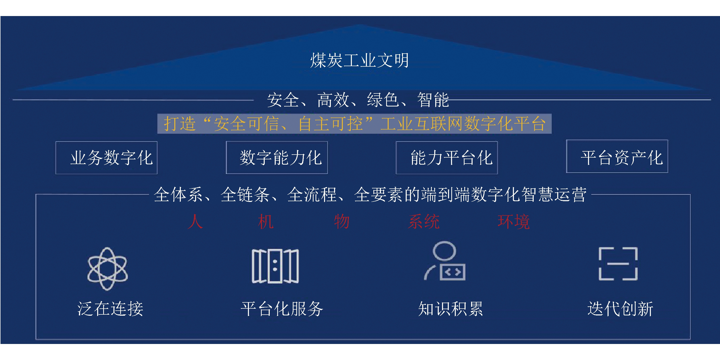 ★ 权威论坛 ★ 以工业互联网推进煤炭产业数字化转型研究与实践1 煤炭产业数字化转型的意义2020年4月公布的《中共中央 国务院关于构建更加完善的要素市场化配置体制机制的意见》首次明确,数据成为继土地、劳动力、资本、技术之外的第五大生产要素。大数据战略成为当下推动时代变革的一个重要抓手。[1]以数据服务能力为核心,以万物感知、万物互联、万物智能为特征的数字经济时代正在加速到来,新一轮科技革命正在全方位地改变社会生产生活方式。 数字经济是全球未来的发展方向,要大力发展数字经济,加快推进数字产业化、产业数字化,推动数字经济和实体经济深度融合。加快推进能源行业数字化是能源产业经济转型升级和高质量发展的必由之路。从企业长远发展来看,构建智能化、低碳化、高效化、产业化发展格局,也是神东可持续发展的战略选择。神东推进智能化建设、数字化转型已经不是“锦上添花”的“选择题”,而是“雪中送炭”的“必答题”,就是要破解安全发展难题,把人从复杂危险的劳动环境中解放出来,进一步提高煤矿工人的体面感、尊严感、获得感、幸福感、安全感;就是要实现“智慧生产、智慧安全、智慧经营、智慧环保”,推动煤炭行业可持续发展和高质量发展。 2 企业现状以及智能煤矿建设中面临的问题数据已成为国家基础性战略资源,国家能源集团高度重视数字化转型,大力推进智能矿山建设。神东作为国家能源集团的骨干企业,是我国首个2亿t煤炭生产基地,现有大型现代化安全高效矿井13个,产能3 000万t/a以上矿井1个,2 000万~3 000万t/a矿井2个,1 000万~2 000万t/a矿井5个,1 000万t/a以下矿井5个。神东致力打造煤炭行业煤矿智能化建设的示范标杆,目前已建成15个智能采煤工作面、15个井工智能掘进工作面和1个智能选煤厂,但继续推进煤矿智能化建设仍然存在以下问题和短板。 2.1 生产运营模式尚未形成生产与决策的智能协同体系神东有1 370多家主要设备供应商,13.4万台各类设备,10余类操作系统,500多种需要适配对接的通信协议。不同的设备装置具有不同的操作系统,同一供应商不同时期提供的操作系统及应用彼此不兼容,造成设备之间数据共享难、信息互通难、生产作业智能联动难,尤其在采煤与运输、采煤与通风、工控系统协同方面,不同厂商的采煤机、液压支架、刮板输送机的接口及协议互不兼容。而煤矿智能化建设需要要统一标准统一架构[2]。建立统一的信息化智能化作业支撑系统,实现智能化协同作业和生产控制,实现自感知自优化的决策支撑,是神东需要着力解决的关键问题。 2.2 安全管理模式尚未形成全域泛在的智能预警体系神东辨识出各类危险源约20 000多条,每年排查出各类安全问题隐患11 000多条,但安全管理依然靠“人盯人、人防人、人管人”,“人机环管”等方面没有智能预警功能,无法动态、在线超前预判重大危险源带来的安全风险。利用AI(人工智能)在线识别已知风险源和不安全行为,自动触发整改电子流,管控整改过程节点,实施整改结果智能评价,实现安全领域快速信息传递、自感知风险预测、智能故障预防、智慧应急管理,是神东智能安全管理体系的研究核心。 2.3 经营管理尚未形成跨越生产和经营的智能决策体系神东目前尚未建立起与智能煤矿、世界一流企业相匹配的、系统的、全面的智能化经营管理系统。各业务系统间数据不能共享,缺乏统一平台,形成“数据孤岛”,让煤矿海量数据陷入“沉睡”。神东自主搭建的生产数据仓库2019年上线,截至目前,持续采集1万台设备的生产数据709 d,在用测点26.8万个,累计存储数据1.43万亿条。今后测点将达到60万~80万个,数据量至少是现在的10~100倍。海量数据可进行收集、整理,但缺乏分析、交互和应用,没有转化成具有智慧决策的支撑力量。神东需要建立一套跨部门、跨专业、跨领域、跨层级“业财联动”的智能化经营管理体系,以实现“生产成本实时精准管理”。 2.4 环保管理尚未形成生产生活实时全天候的智能联动体系神东的环保监测监控体系未能集成环境治理、水土保持、节能低碳、地质环境与土地复垦相关监测监控指标,没有实现全天候实时监测,未形成神东矿区一体化生态环境监测监控系统,未能实现污染防治、生态修复、营造管护等指标的全部数字化、体系化、标准化。 3 工业互联网是实现煤矿数字化转型的重要基础要补上以上短板,必须应用工业互联网。工业互联网是数据标准和运行规则集成的技术体系,更是产业链、供应链、价值链、创新链上下游协同的生态体系。 3.1 工业互联网是能源产业数字化转型的重要保障在新一轮科技革命和产业变革深入发展的背景下,数字经济及其与实体经济的深度融合终将演变为一种数据驱动型经济,生产力和生产关系都将被重新定义[3]。数字经济时代,数据是核心生产资料,算力成为生产力,工业互联网组织了新的生产关系,使得大数据和AI成为重要的生产工具。工业互联网构建的数字产业大生态,将推动能源产业发展模式、生产方式深刻变革,为行业智能化建设、数字化转型提供强大支撑保障。 工业互联网主要体现在对人、机、物、系统进行全面数字化连接,实现能源产业“生产要素的数字化”,可造就产业资源要素新形态;对产业全时域泛在海量数据进行融合共享与价值挖掘,使能