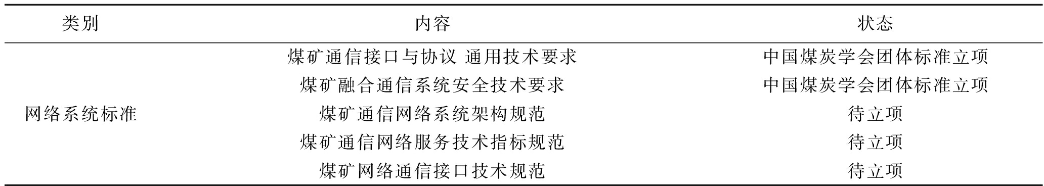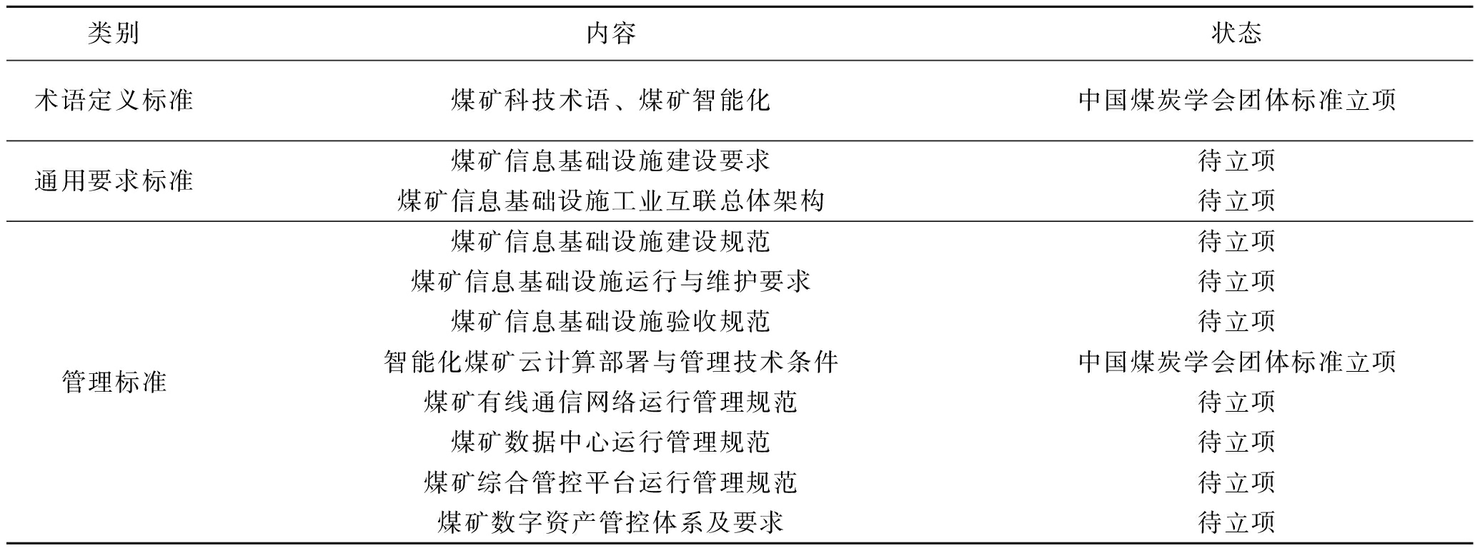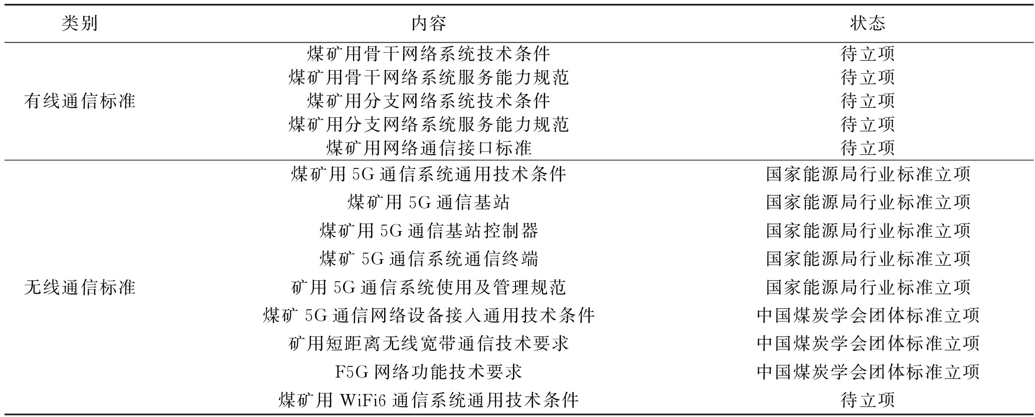 类别内容状态术语定义标准煤矿科技术语、煤矿智能化中国煤炭学会团体标准立项通用要求标准煤矿信息基础设施建设要求待立项煤矿信息基础设施工业互联总体架构待立项管理标准煤矿信息基础设施建设规范待立项煤矿信息基础设施运行与维护要求待立项煤矿信息基础设施验收规范待立项智能化煤矿云计算部署与管理技术条件中国煤炭学会团体标准立项煤矿有线通信网络运行管理规范待立项煤矿数据中心运行管理规范待立项煤矿综合管控平台运行管理规范待立项煤矿数字资产管控体系及要求待立项 (1)术语定义标准:主要规范信息基础设施的相关概念,此部分内容可包含在文献[3]的煤矿智能化术语定义中。 (2) 通用要求标准:主要规范信息基础设施的功能、性能、安全、可靠性等方面要求。 (3)管理标准:主要规范信息基础设施的建设、验收、运行、维护等方面的管理要求。 3.2 通信网络标准通信网络标准子体系主要规范智能化煤矿通信和网络的要求。目前急需制定的通信网络标准内容见表2。 表2 急需制定的相关通信网络标准