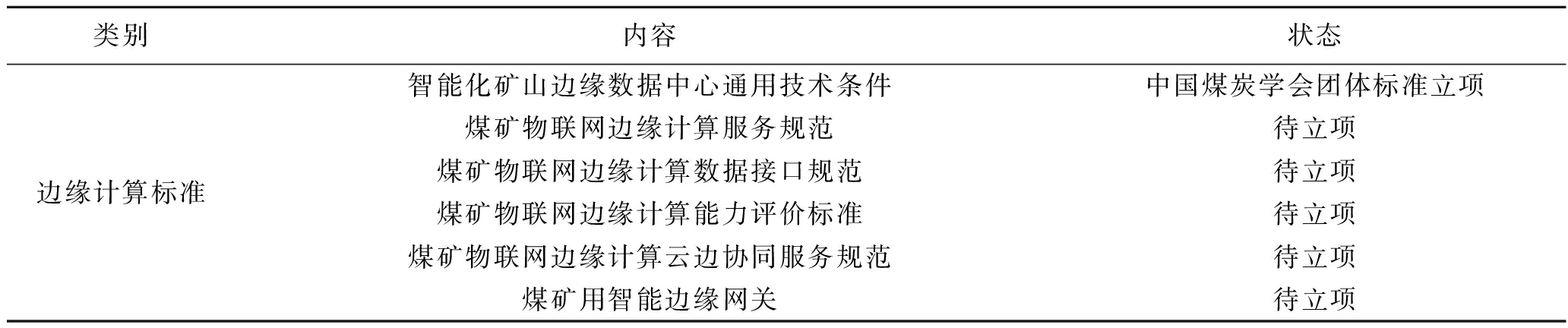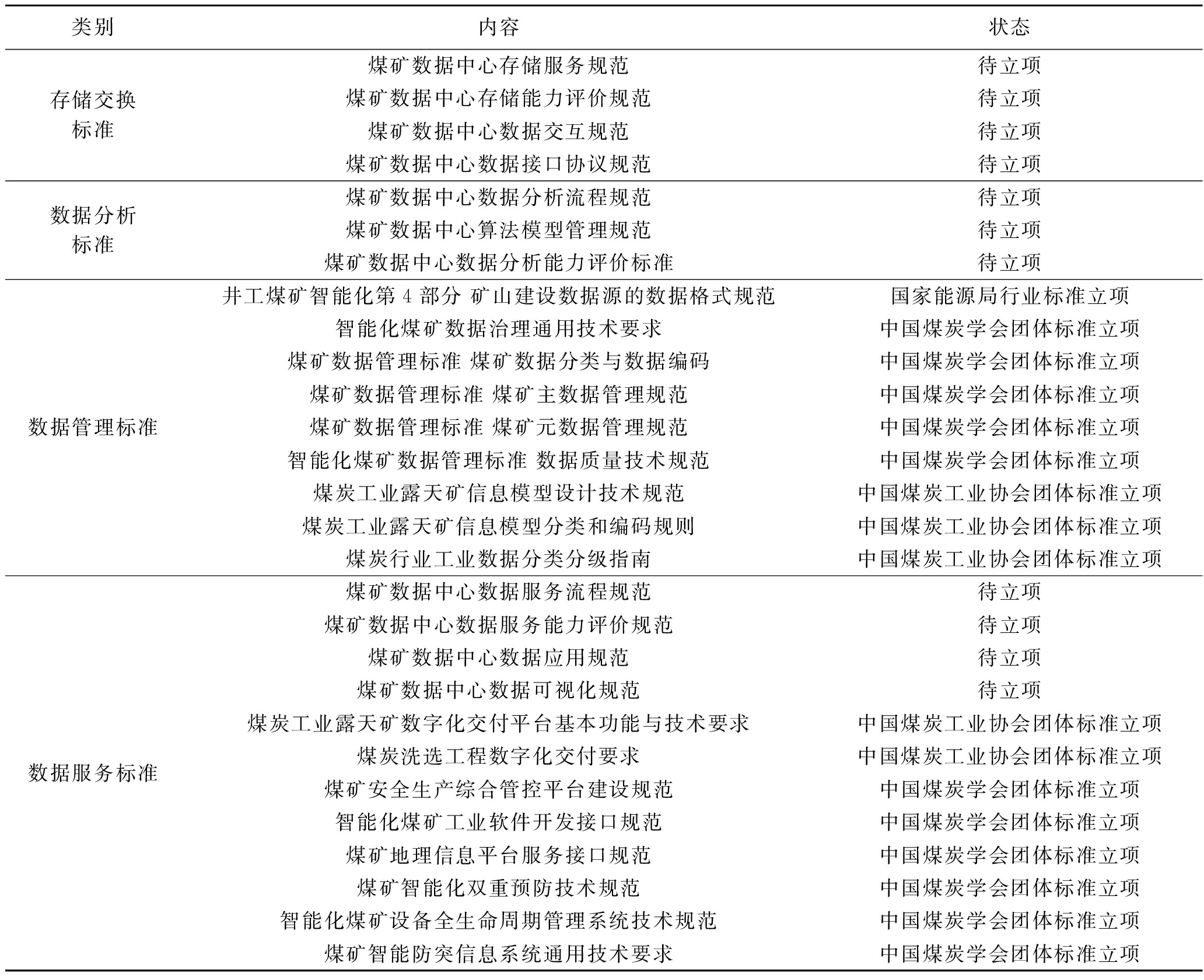 类别内容状态边缘计算标准智能化矿山边缘数据中心通用技术条件中国煤炭学会团体标准立项煤矿物联网边缘计算服务规范待立项煤矿物联网边缘计算数据接口规范待立项煤矿物联网边缘计算能力评价标准待立项煤矿物联网边缘计算云边协同服务规范待立项煤矿用智能边缘网关待立项 (1)标识解析标准:主要规范煤矿生产过程中的“人、机、环”状态信息的编码与描述要求,包括时间、位置、传感数据、指标参数、状态等信息,并规范相应的采集、解析、处理和应用要求。 (2)设备互联标准:主要规范各类设备互联需要的操作系统、接口协议等方面的要求,包括多系统之间交互信息的编码标准、连接服务要求、数据接口要求以及信息交互协议要求等。 (3)边缘计算标准:主要规范煤矿设备边缘端的数据采集、数据处理、边缘设备计算能力、云边协同等方面的要求,包括边缘端针对主要子系统的计算服务范围、相关业务数据的处理能力要求与边界、边缘端的服务能力等级评价等内容。 3.4 煤矿数据标准煤矿数据标准子体系主要规范煤炭企业数据存储、交换、分析、管理、服务等要求。目前急需制定的煤矿数据标准内容见表4。 表4 急需制定的相关煤矿数据标准