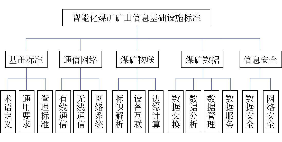权威探讨 智能化煤矿信息基础设施标准体系研究0 引言煤矿智能化是煤炭工业高质量发展的核心技术支撑[1]。2020年2月,国家发展改革委、应急管理部、国家能源局、国家煤矿安全监察局、工业和信息化部、财政部、科技部、教育部等八部门联合印发了《关于加快煤矿智能化发展的指导意见》,提出我国煤矿智能化建设的3个阶段性目标:到2021年建成多种类型、不同模式的智能化示范煤矿,到2025年大型煤矿和灾害严重煤矿基本实现智能化,到2035年各类煤矿基本实现智能化;并要求强化标准引领,开展煤矿智能化标准体系建设,提升基础保障能力。 煤矿智能化建设是新一代信息技术与煤炭开发利用的深度融合。当前,煤矿智能化建设尚处于初级阶段[2],存在建设理念不够清晰、标准规范缺失、数据烟囱林立、信息难以共享等问题。王国法院士等在详细分析煤矿智能化标准现状的基础上,构建了煤矿智能化标准体系框架,提出了煤矿智能化标准体系建设路径[3]。信息基础设施是煤矿数据采集、传输、计算、应用、管理的基础,涉及通信、网络、平台、模型等多方面内容,能够为煤矿的开采、掘进、机电、运输、通风、选煤等环节提供信息化基础支撑。为此,笔者在文献[3]提出的煤矿智能化标准体系基础上,围绕数据规范、通信接口、信息安全等重点要求,深入研究了智能化煤矿信息基础设施的标准体系,以期为煤矿智能化相关标准的制修订提供参考和指导。 1 煤矿信息基础设施煤矿智能化是新一代ICT技术与煤炭开发利用的深度融合,煤矿信息基础设施是煤矿智能化建设的底层支撑。当前,由于缺少行业标准,现存的各个信息系统互联互通难度大,各种设备接口不统一,严重制约了数据的流通和协同。因此,非常有必要建立统一的数据规范和通讯接口,并提升智能化煤矿的信息安全性、系统灵活性和可扩展性。 《煤矿智能化建设指南(2021年版)》在煤矿智能化建设目标、总体设计、建设要求和建设内容中均提出了信息基础设施方面的要求,具体如下[4]所述。 井工煤矿应统筹建设网络系统和数据中心,打通数据传输和利用通道。其中网络基础设施包括但不限于办公区网络、生活福利区网络、工业控制网络、视频监控网络、安全监控网络、无线网络和融合调度通信系统,鼓励开展5G+矿山物联网系统建设;大数据服务中心应统一数据采集、传输、存储和访问接口标准,构建煤矿数据治理体系,并形成模型库和知识库。 露天煤矿应结合生产工艺流程,应用自动控制、智能感知技术对生产设备设施进行数字化改造,完善工业网络及信息安全建设。在智能感知方面要实现矿山环境数据、采矿装备状态信息、工况参数、移动巡检数据等的全面采集;在网络建设方面要实现主要办公区、主要采区、受控区域、装备作业区等重点区域的网络全覆盖。 2 信息基础设施标准体系框架智能化煤矿信息基础设施标准体系包括基础标准、通信网络标准、煤矿物联标准、煤矿数据标准、信息安全标准等5个子体系。智能化煤矿信息基础设施标准体系框架结构如图1所示。 从图1可知,基础标准包括术语定义、通用要求、管理标准;通信网络标准包括有线通信、无线通信、网络系统;煤矿物联标准包括标识解析、设备互联、边缘计算;煤矿数据标准包括数据交换、数据分析、数据管理、数据服务;信息安全标准包括数据安全、网络安全。