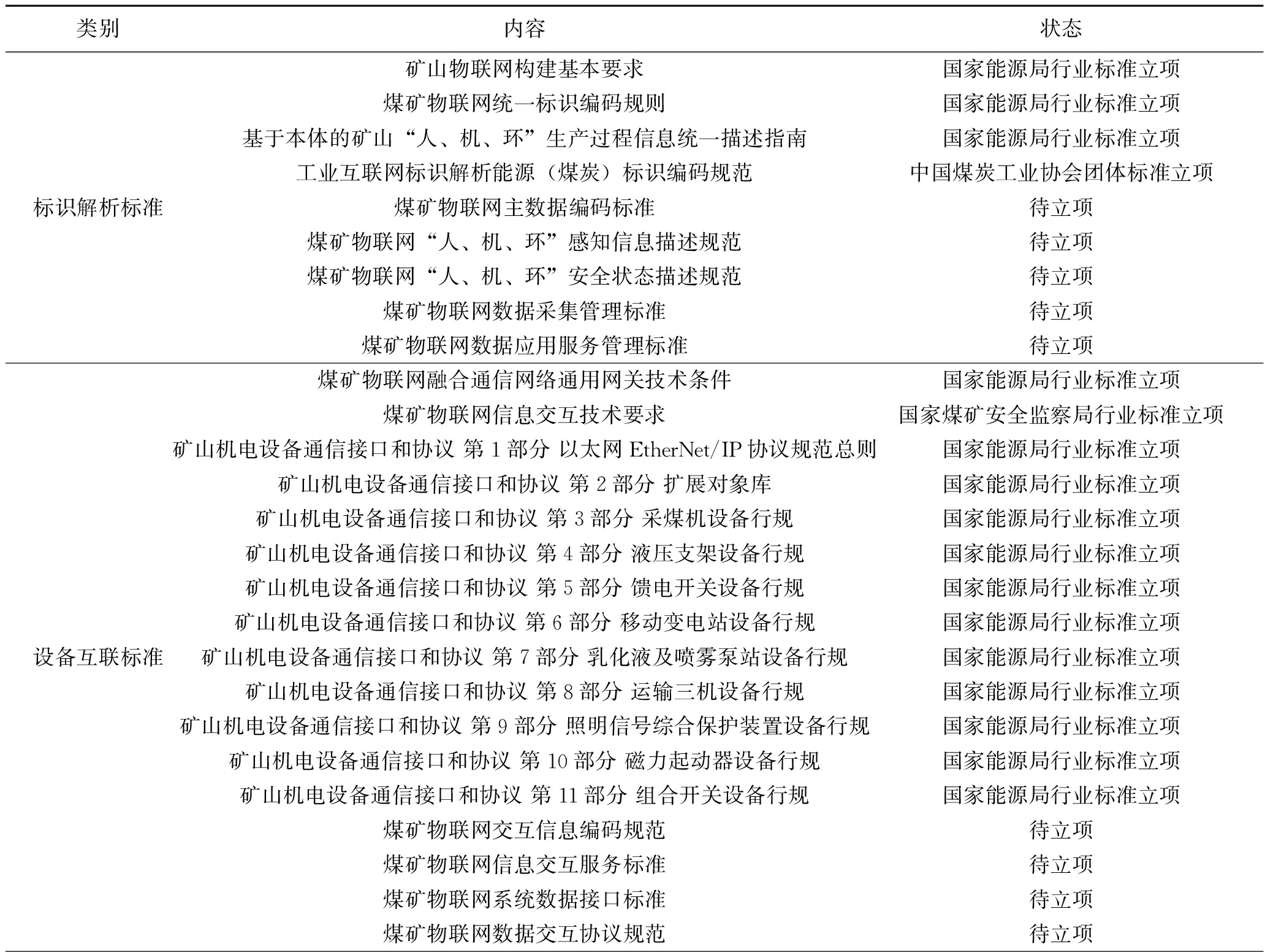 类别内容状态网络系统标准煤矿通信接口与协议 通用技术要求中国煤炭学会团体标准立项煤矿融合通信系统安全技术要求中国煤炭学会团体标准立项煤矿通信网络系统架构规范待立项煤矿通信网络服务技术指标规范待立项煤矿网络通信接口技术规范待立项 (1)有线通信标准:主要规范工业以太网、F5G等有线通信的硬件接口形式、通信协议规范,带宽、速率、时延等分级指标要求,以及性能、安全等方面要求。 (2)无线通信标准:主要规范5G、WiFi6等无线通信的频谱使用规范、发射功率要求、天线指标参数、通信协议规范,带宽、速率、时延等分级指标要求,以及性能、安全等方面要求。 (3)网络系统标准:主要规范煤矿通信网络的通信方式、网络架构、通信协议、硬件接口、指标参数规范,井上、井下骨干网络的带宽、速率、时延等指标等级规范,骨干网络容灾能力,下级网络带宽、速率、时延等指标等级规范,网络传输端到端速率、时延指标要求,以及性能、安全等方面要求。 3.3 煤矿物联标准煤矿物联标准子体系主要规范煤矿设备的互联要求。目前急需制定的煤矿物联标准内容见表3。 表3 急需制定的相关煤矿物联标准