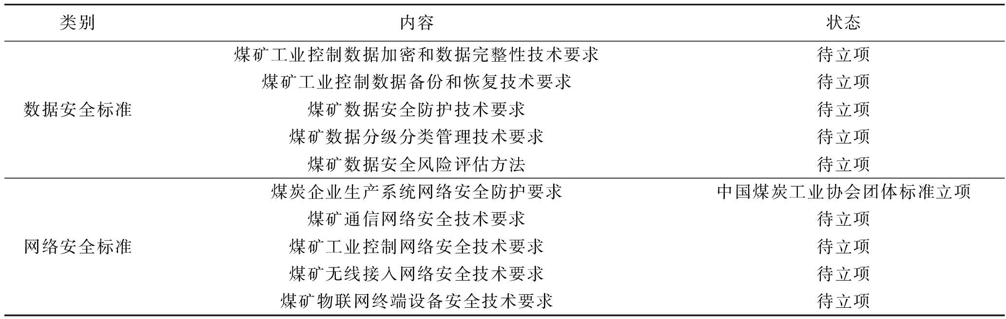 类别内容状态数据安全标准煤矿工业控制数据加密和数据完整性技术要求待立项煤矿工业控制数据备份和恢复技术要求待立项煤矿数据安全防护技术要求待立项煤矿数据分级分类管理技术要求待立项煤矿数据安全风险评估方法待立项网络安全标准煤炭企业生产系统网络安全防护要求中国煤炭工业协会团体标准立项煤矿通信网络安全技术要求待立项煤矿工业控制网络安全技术要求待立项煤矿无线接入网络安全技术要求待立项煤矿物联网终端设备安全技术要求待立项 (1)数据安全标准:主要规范数据的安全防护要求及分类分级等管理及技术要求。 (2)网络安全标准:主要规范边缘设备、现场设备、工业网络的信息安全方面的要求。 4 结语智能化煤矿信息基础设施标准体系是煤矿智能化标准体系的重要组成部分,鼓励煤炭生产企业先行创新性探索制定企业标准,为制定行业标准奠定基础:一是制定统一的设备接入接口和协议标准;二是围绕煤矿生产、机电、安监、环保等要求,制定智能化煤矿统一数据编码;三是制定统一的工业信息化模型标准,规范设备编码、设备数据釆集、二次计算等;四是制定统一的集成规范,包括应用风格设计规范、应用移动端APP融合集成规范、用户管理规范等。 [1] 王国法,刘峰,庞义辉,等.煤矿智能化:煤炭工业高质量发展的核心技术支撑[J].煤炭学报,2019,44(2):349-357. [2] 王国法,刘峰,孟祥军,等.煤矿智能化(初级阶段)研究与实践[J].煤炭科学技术,2019,47(8):1-36. [3] 王国法,杜毅博.煤矿智能化标准体系框架与建设思路[J].煤炭科学技术, 2020, 48(1): 1-9. [4] 国家能源局,国家矿山安全监察局. 国家能源局 国家矿山安全监察局关于印发《煤矿智能化建设指南(2021年版)》的通知(国能发煤炭规〔2021〕29号)[EB/OL]. (2021-06-05)[2021-11-05]. http://zfxxgk.nea.gov.cn/2021-06/05/c_1310015723.htm. [5] 中国煤炭学会. 中国煤炭学会关于2021年第一批煤矿智能化标准研制项目的通知[EB/OL]. (2021-05-27)[2021-11-05].http://www.chinacs.org.cn/a1741.html. [6] 国家能源局. 国家能源局综合司关于下达2021年能源领域行业标准制修订计划及外文版翻译计划的通知(国能综通科技〔2021〕92号)[EB/OL].(2021-09-30)[2021-11-05]. http://zfxxgk.nea.gov.cn/2021-09/30/c_1310257326.htm. [7] 中国煤炭工业协会. 关于下达2021年中国煤炭工业协会团体标准制定计划项目的通知(中煤协会科技函〔2021〕154号)[EB/OL].(2021-10-25)[2021-11-05].http://www.coalchina.org.cn/index.php?m=content&c=index&a=show&catid=61&id=134264 Research on information infrastructure standard system for intelligent coal mine
