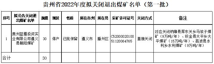 贵州省2022年度拟关闭退出煤矿名单(第1批)公示