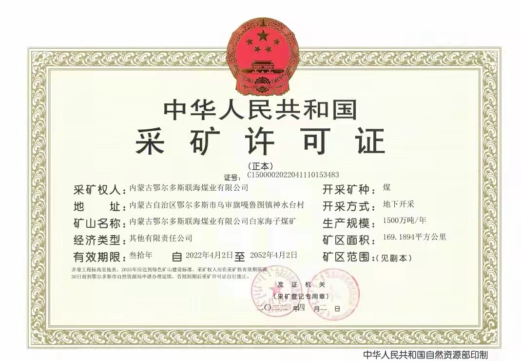 2022年4月2日,经内蒙古自治区自然资源厅审核同意,鄂尔多斯市自然资源局为内蒙古鄂尔多斯联海煤业有限公司颁发了内蒙古鄂尔多斯联海煤业有限公司白家海子煤矿采矿许可证,实现了该煤矿合法化生产。内蒙古鄂尔多斯联海煤业有限公司白家海子煤矿矿区面积169.1894平方公里,核定生产规模1500万吨/年。 (责任编辑:admin) |