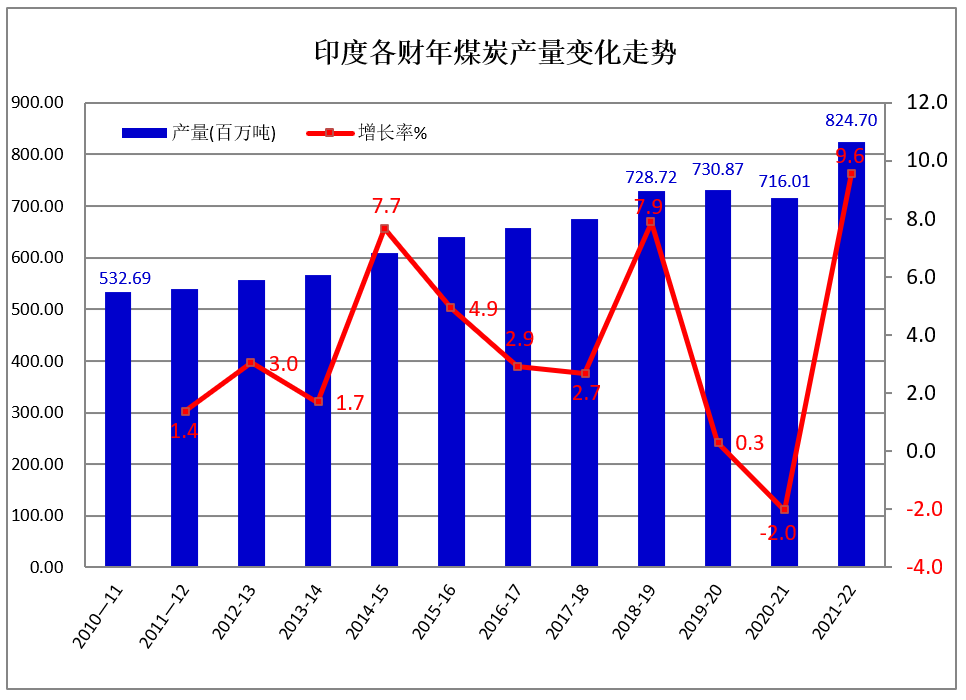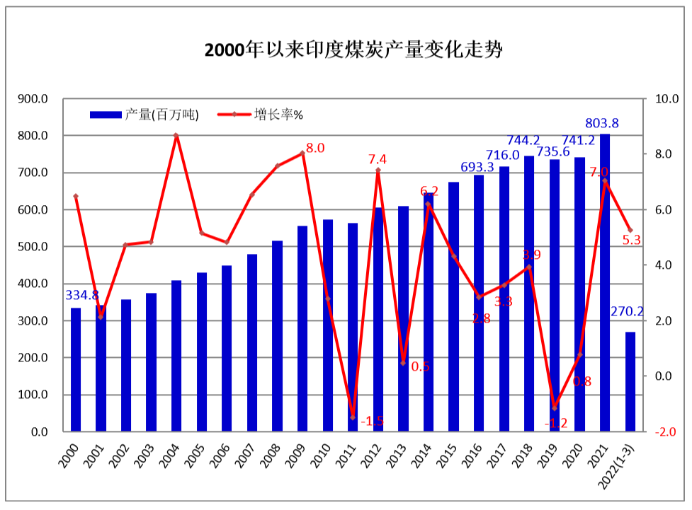 2022年一季度印度煤炭产量同比增长5.3%