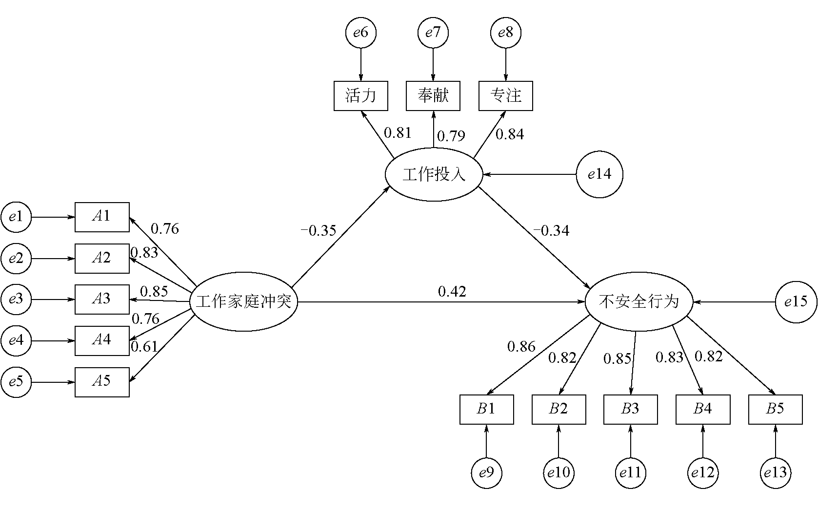 拟合指标c2/dfGFIAGFINFICFIRMSEA测量值1.1200.9630.9460.9680.9960.021合理范围1~3>0.9>0.9>0.9>0.9<0.08 从表2可以看出,卡方自由度比c2/df、拟合优度指数GFI、调整拟合优度指数AGFI、正规拟合指数NFI、比较拟合指数CFI以及近似误差均方根RMSEA的指标值都处于合理范围,表明该模型的拟合效果较好。 3.3 结果分析在AMOS中工作家庭冲突、工作投入与不安全行为的路径关系如图2所示,图中A1~A5、B1~B5分别表示工作家庭冲突、不安全行为的观测变量,活力、奉献和专注分别表示工作投入的3个维度,e1~e13分别表示上述观测变量的残差,e14、e15分别表示工作投入和不安全行为两个潜变量的残差。各路径的回归系数见表3,其中,路径1表示工作家庭冲突对不安全行为路径,路径2表示工作家庭冲突对工作投入路径,路径3表示工作投入对不安全行为路径。