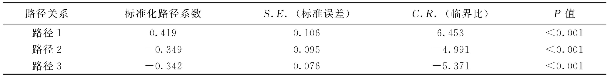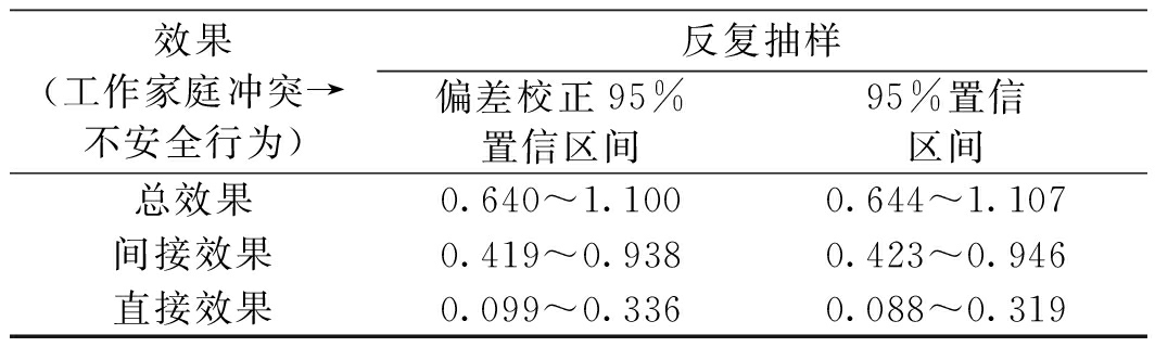 路径关系标准化路径系数S.E.(标准误差)C.R.(临界比)P值路径10.4190.1066.453<0.001路径2-0.3490.095-4.991<0.001路径3-0.3420.076-5.371<0.001 根据表3结果可知,工作家庭冲突到矿工不安全行为的路径系数为0.419,在P<0.001的水平下显著,表明工作家庭冲突对矿工不安全行为有显著正向影响,假设H1成立;工作家庭冲突到工作投入以及工作投入到不安全行为的路径系数分别为-0.349和-0.342,均在P<0.001的水平下显著,表明工作家庭冲突显著负向影响矿工的工作投入,且工作投入显著抑制矿工不安全行为的产生,假设H2、H3成立。 关于工作投入的中介效应,利用AMOS 21.0中的Bootstrap置信区间法进行检验,检验结果见表4。 表4 中介效应检验