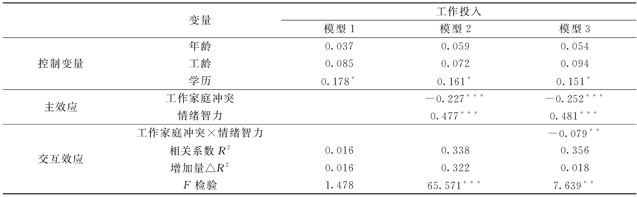 效果(工作家庭冲突→不安全行为)反复抽样偏差校正95%置信区间95%置信区间总效果0.640~1.1000.644~1.107间接效果0.419~0.9380.423~0.946直接效果0.099~0.3360.088~0.319 最后,运用分层回归分析法对情绪智力在工作家庭冲突与工作投入间的调节作用进行检验。调节效应的检验结果见表5。模型1将控制变量(年龄、工龄、学历)加入回归方程,模型2再将自变量工作家庭冲突和调节变量情绪智力加入回归方程,模型3进一步将工作家庭冲突和情绪智力的交互项加入回归方程。 由表4结果可知,工作家庭冲突对矿工不安全行为总效果的置信区间不包括0,表明工作家庭冲突到不安全行为之间可能存在中介效应;工作家庭冲突到矿工不安全行为的间接效果的置信区间不包含0,表明工作家庭冲突到矿工不安全行为间存在中介效应。又因为工作家庭冲突对矿工不安全行为的直接效果的置信区间不包含0,表明工作投入在工作家庭冲突与矿工不安全行为间是部分中介效应,故假设H4成立。 表5 调节效应的分层回归结果