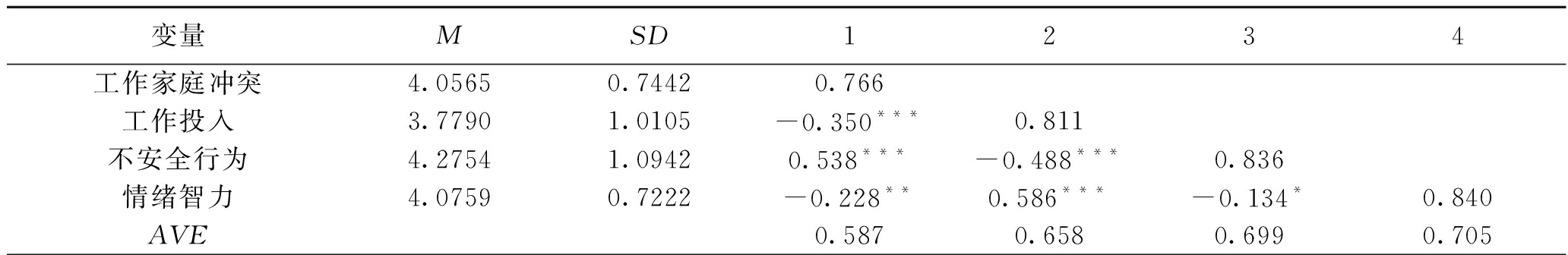 图1 理论关系模型 2 研究方法2.1 研究对象对山西焦煤集团柳湾煤矿、潞安化工集团夏店煤矿、晋能控股集团四老沟矿、山西寿阳段王集团平安煤业以及西山煤电西曲矿等5个煤矿企业的一线矿工进行问卷调查。共计发放问卷315份,有效回收276份,有效样本率达87. 62%,回收效果良好。对矿工的基本信息进行汇总统计,将调查对象按照年龄结构划分,30岁以下的占29.6%,30~49岁的占47.2%,50岁及以上的占23.2%;按照工龄划分,5年以下的占40.1%,5~10年的占36.3%,10年以上的占23.6% ;按照学历划分,初中及以下的占39.4%,高中及专科的占42.8%,本科及以上的占17.8% 。 2.2 问卷设计本问卷包括个人基本信息(年龄、工龄、学历)和测量量表两大部分。其中,测量量表部分包含工作家庭冲突、工作投入、不安全行为以及情绪智力4个量表共计35个题项。对工作家庭冲突的测量参考NETEMEYER R G[20]编制的经典量表,包括在工作上花费过多时间而忽略了家庭(A1)、 工作要求干扰了我正常的家庭生活(A2)、由于工作原因,我想在家里做的事情没有完成(A3)、工作压力使我难以履行家务(A4)、与工作相关的职责使我必须改变家庭活动计划(A5)等5个题项;对工作投入的测量参考SCHAUFELI W B[21]开发的量表,包括我通常在工作中感到干劲十足(W1)、工作中的我强大且充满活力(W2)、早上一起床,我就想去工作(W3)、我对自己的工作富有热情(W4)、工作激发了我的灵感(W5)、我为所从事的工作而感到自豪(W6)、工作紧张时我会感到快乐(W7)、我沉浸于自己的工作中(W8)、我在工作时会达到忘我的境界(W9)等9个题项;对不安全行为的测量参考张倩[22]的量表,包括拆分机械装置及其他安全配置(B1)、使用无安全设施的设备或工具(B2)、用手替代工具进行操作(B3)、 会违章作业(B4)、不懂装懂,错误操作(B5)等5个题项;对情绪智力的测量参考WONG C S等[23]编制的量表,包括我通常清楚地知道自己产生某种情绪的原因(Q1)、我了解自己的情绪(Q2)、我确切地理解我内心的感受(Q3)、我一直都知道自己是否快乐(Q4)、我能根据朋友的行为获知他的情绪状态(Q5)、我能很好地观察到他人情绪(Q6)、我对他人的感觉和情绪很敏感(Q7)、我能较好地理解周围人的情绪(Q8)、我总为自己设立目标并尽全力去完成(Q9)、我总告诉自己我是一个能干的人(Q10)、我是一个自我激励的人(Q11)、我总是鼓励自己要尽全力(Q12)、我能控制我的脾气并理智地处理问题(Q13)、我能完全控制我自己的情绪(Q14)、我能在生气时让自己迅速冷静下来(Q15)、 我对自己的情绪有很好的掌控(Q16)等16个题项。各量表均采用 Likert 7点量表,1表示非常不同意,7表示非常同意,1~7依次肯定递增。 3 数据检验与分析3.1 信度与效度检验运用SPSS23.0对收回的量表进行信度及效度检验。采用内部一致性信度中的Cronbach's α系数作为信度的估计指标,经检验得到工作家庭冲突、工作投入、不安全行为以及情绪智力的Cronbach's α系数分别为0.872、0.852、0.920和0.942。各量表的信度均在0.8以上,说明量表信度良好。再对KMO和Bartlett球形检验值进行测算,得出量表的KMO值为0.885,Bartleet球形检验的P值小于0.001,说明该量表具有较好的结构信度;对各量表的均值M、标准差SD、平均方差提取值AVE以及各变量之间的相关系数进行测算,结果见表1,其中对角线上的数值是AVE的均方根。根据表1结果可知,各变量之间显著相关,且所有变量的AVE值均大于0.5,相关系数均小于各自AVE的均方根,说明量表的区分效度良好。 表1 描述性统计分析
