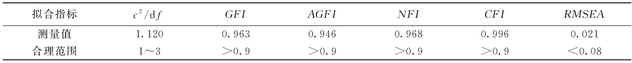 变量MSD1234工作家庭冲突4.05650.74420.766工作投入3.77901.0105-0.350***0.811不安全行为4.27541.09420.538***-0.488***0.836情绪智力4.07590.7222-0.228**0.586***-0.134*0.840AVE0.5870.6580.6990.705 注:*表示显著性P<0.05,** 表示显著性P<0.01,***表示显著性P<0.001。 3.2 拟合检验利用AMOS 21.0对工作家庭冲突、工作投入和不安全行为的理论假设模型进行检验,各拟合指标结果见表2。 表2 模型拟合结果