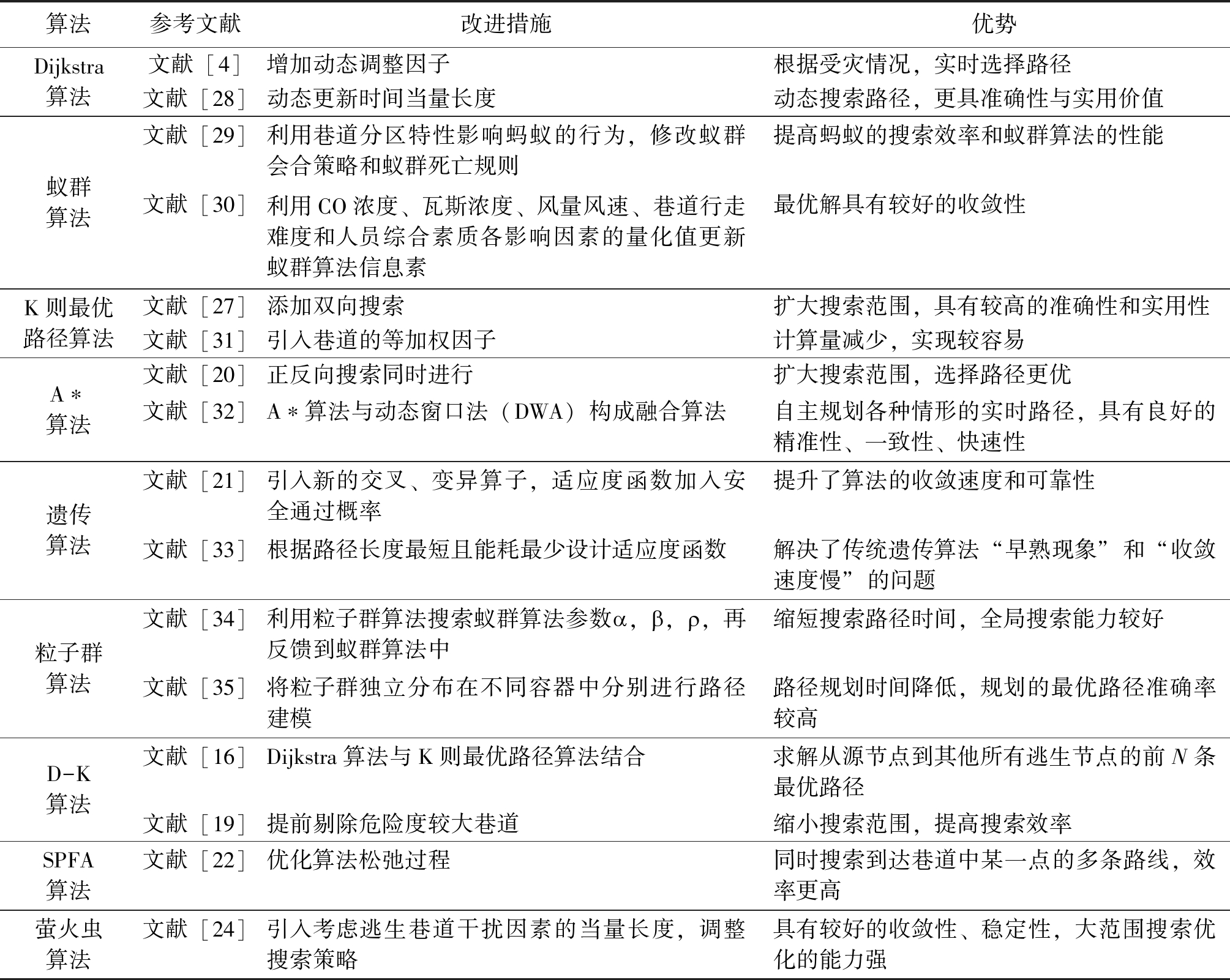 参考文献影响巷道通行能力因素巷道类型巷道坡度风速风向障碍物数水位高度避灾路径规划原则研究方法文献来源赵作鹏等[16] 静态路径权值最短D-K算法煤炭学报张雪英等[17] 静态路径权值最短离散萤火虫算法工矿自动化周越等[18] 静态安全、路径权值最短改进Dijkstra算法煤矿安全苑亚南等[19] 静态安全、路径权值最短改进D-K算法中国矿业刘梦杰等[20] 路径权值最短双向A∗算法煤炭工程蔡明杰等[21-22] 静态路径权值最短改进遗传算法优化SPFA算法煤炭技术煤田地质与勘探ZHAO Xiangwei等[23] 实时实时动态路径权值最短改进Dijkstra算法Geomatics, NaturalHazards and Risk王鹏等[24] 路径权值最短改进萤火虫算法中国矿业 4 常用算法总结根据以上分析,可以得出进行矿井/煤矿瓦斯/火灾/水灾避灾/逃生路径/路线规划研究常用的算法如图4所示。由图4可以直观地看出,在研究煤矿井下避灾路径规划中运用Dijkstra算法最多,然后依次是蚁群算法、K则最优路径算法、A*算法、遗传算法、粒子群算法、D-K算法、SPFA算法、萤火虫算法。同时对各种算法进行简要归纳,列举相关的改进措施及优势,结果见表4。