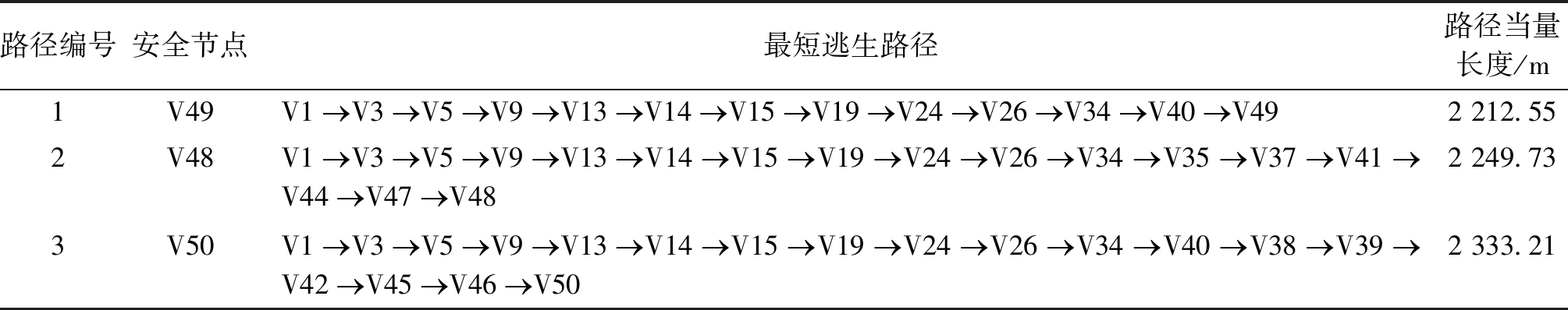 路径编号安全节点最短逃生路径路径当量长度/m1V49V1 V3 V5 V9 V13 V14 V15 V19 V24 V26 V34 V40 V492 212.552V48V1 V3 V5 V9 V13 V14 V15 V19 V24 V26 V34 V35 V37 V41 V44 V47 V482 249.733V50V1 V3 V5 V9 V13 V14 V15 V19 V24 V26 V34 V40 V38 V39 V42 V45 V46 V502 333.21 由于研究的是在同一个工作面工作的矿工人员逃生,人数相对来说不是很多,所以从这3条中选取1条最优的路径作为逃生路径即可,则从突水点到安全节点的最优逃生路径为:V1→V3→V5→V9→V13→V14→V15→V19→V24→V26→V34→V40→V49,路径当量长度最短为2 212.55 m。 6 结论(1)矿井瓦斯爆炸事故避灾路径规划研究中,毒害气体(CO 、H2S等)、瓦斯爆炸冲击波、高温、耗氧为主要的灾害因素,路径权值最短和安全逃生时间最短为主要构建模型的原则,相对火灾、水灾事故来看,由于瓦斯爆炸事故环境较复杂,所以该主题相关研究比较少。 (2)矿井火灾事故避灾路径规划研究中,温度、毒害气体(CO等)、烟雾浓度为主要的灾害因素,路径权值最短为主要构建模型的原则,运用Dijkstra算法和蚁群算法求解最优避灾路径的研究较多。 (3)矿井水灾事故避灾路径规划研究中,水位高度为主要的灾害因素,路径权值最短为主要构建模型的原则,运用Dijkstra算法、蚁群算法、K则最优路径算法求解最优避灾路径的研究较多。 整体来看,国内研究矿井灾害领域避灾路径相关论文总量较多,国外较少;在研究内容上,很少考虑灾害环境对人体健康损失度、人的心理状态的影响,且运用改进算法求解实时避灾路径的研究较少,值得进一步发展和探索。 [1] 景国勋,秦瑞琪.2011-2020年我国煤矿水害事故相关因素特征分析[J/OL].安全与环境学报:1-9.(2021-08-06)[2022-02-08].https://doi.org/10.13637/j.issn.1009-6094.2021.0707. [2] 李雷雷,丁晓文,梁跃强,等.基于灾区环境的矿井瓦斯爆炸事故应急救援方法研究[J].煤矿安全,2022,53(1):237-242. [3] 石永奎,刘阳,张景煜.煤矿采场爆炸人员疏散模型研究[J].煤矿安全,2015,46(10):228-231. [4] 徐志奇.井下瓦斯蔓延趋势分析与避灾路线动态规划方法[J].内蒙古煤炭经济,2017(13):128-129. [5] 杨林,刘勇,江成玉.煤与瓦斯突出后最佳避灾路线的研究[J].煤炭技术,2014,33(12):213-215. [6] 贾齐林,吴蒸,沈虎,等.基于瓦斯煤尘爆炸的矿井紧急避险系统研究[J].西安科技大学学报,2016,36(6):787-792. [7] 黄运爽,刘阳,张良良,等.煤矿采场灾害人员疏散模型及避灾硐室布置[J].煤矿安全,2017,48(6):112-115. [8] 郭昕曜.高突矿井瓦斯风险评估方法与管控技术研究[D].武汉:武汉理工大学,2019. [9] 芦飞平.基于Repast的煤矿井下安全逃生仿真研究[D].太原:太原科技大学,2020. [10] 王金华,汪有刚,张雷,等.基于实时数据的井下避灾路线动态规划与发布方法研究[J].中国煤炭,2015,41(2):67-71,83. [11] 赵海军.基于改进差分进化算法的煤矿井下逃生路径优化[J].山西煤炭,2017,37(1):51-55. [12] 姜媛媛,时美乐.基于多元信息评估的矿井火灾救援路径优化[J].工矿自动化,2019,45(3):5-11. [13] WANG Kai,HAO Haiqing,JIANG Shuguang, et al. Escape route optimization by cellular automata based on the multiple factors during the coal mine disasters[J]. Natural Hazards,2019,99(1):101-103. [14] 刘怡.基于信息熵模型的矿井火灾逃生路径规划算法研究[D].武汉:武汉科技大学,2020. [15] 沈云鸽.矿井火灾时期人员逃生环境风险及逃生路基于改进差分进化算法的煤矿井下逃生路径优化径优选[D].徐州:中国矿业大学,2020. [16] 赵作鹏,宋国娟,宗元元,等.基于D-K算法的煤矿水灾多最优路径研究[J].煤炭学报,2015,40(2):397-402. [17] 张雪英,李智勇,李凤莲,等.用于求解井下最短逃生路径问题的离散萤火虫算法[J].工矿自动化,2016,42(12):30-35. [18] 周越,朱希安,王占刚.矿井水灾逃生路径建模及路径规划研究[J].煤矿安全,2018,49(11):199-203. [19] 苑亚南,朱希安,王占刚.矿井水灾多逃生路径模型应用研究[J].中国矿业,2019,28(1):135-140. [20] 刘梦杰,朱希安,王占刚,等.基于双向A*算法的矿井水灾逃生路径应用研究[J].煤炭工程,2019,51(9):42-47. [21] 蔡明杰,朱希安,王占刚.基于改进遗传算法的矿井突水避险路径规划[J].煤炭技术,2019,38(3):95-97. [22] 蔡明杰,朱希安,刘德民,等.基于优化SPFA算法的矿井突水救援模型[J].煤田地质与勘探,2019,47(6):78-83. [23] ZHAO Xiangwei,WANG Qingzhong,XIE Bin, et al. A dynamic rescue route planning method based on 3D network in mine water inrush hazard[J]. Geomatics, Natural Hazards and Risk,2019,10(1):9-12. [24] 王鹏,朱希安,王占刚,等.基于改进萤火虫算法的矿井水害避灾路径规划[J].中国矿业,2021,30(6):106-111. [25] DU Yuanze, WU Qiang, ZHAO Yingwang, et al. A parallel time-varying earliest arrival path algorithm for evacuation planning of underground mine water inrush accidents[J]. Concurrency and Computation: Practice and Experience,2020,32(11):3-6. [26] WU Qiang,DU Yuanze,XU Hua, et al. Finding the earliest arrival path through a time-varying network for evacuation planning of mine water inrush[J]. Safety Science,2020,130:3-5. [27] 卢国菊,高彩军.矿井灾变时期最优避灾路径研究[J].矿业安全与环保,2017,44(2):70-73. [28] 周越,朱希安,王占刚.Dijkstra算法在矿井水灾动态避灾路径中的改进与应用[J].煤炭工程,2019,51(3):18-22. [29] YAN Guangwei,FENG Dandan,YAO Baozhen. Escape-route planning of underground coal mine based on improved ant algorithm[J]. Mathematical Problems in Engineering,2013:5-6. [30] 龚星宇,常心坦,贾澎涛,等.基于蚁群算法的井下救援路径优化方法[J].工矿自动化,2018,44(3):76-81. [31] 成韶辉,张雪英,李凤莲,等.K则最