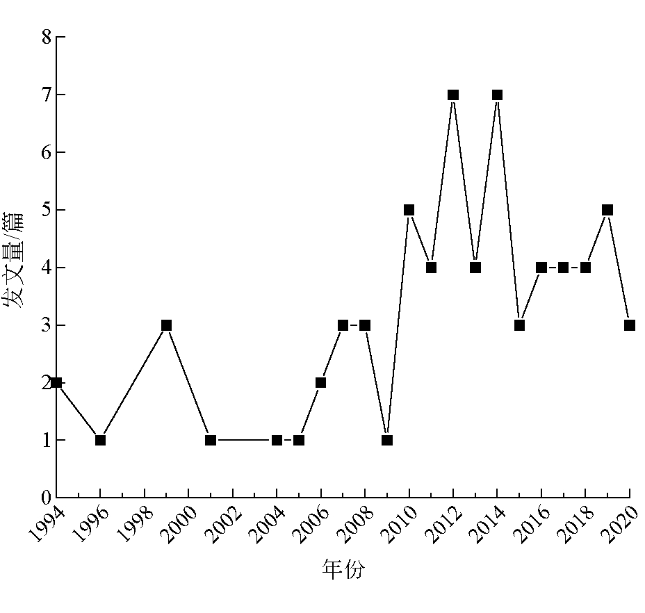 参考文献影响巷道通行能力因素巷道类型巷道坡度风速风向障碍物数毒害气体冲击波其他避灾路径规划原则研究方法文献来源石永奎等[3] 人群密度安全逃生时间最短Lingo编程求最短路径煤矿安全徐志奇[4] 路径权值最短Dijkstra算法求k条最短路线内蒙古煤炭经济杨林等[5] 路径权值最短Dijkstra算法煤炭技术黄运爽等[7] 高温安全逃生时间最短Anylogic仿真煤矿安全郭昕曜[8] 高温耗氧路径权值最短Flody算法武汉理工大学 2 矿井火灾事故避灾路径规划2.1 矿井火灾事故特性矿井火灾是一种不受控制的燃烧,分为内因火灾和外因火灾两种,可能发生在矿井井下或地面井口附近,矿井火灾的发生不仅会对矿井安全生产造成巨大威胁,还会因火灾产生的高温、烟尘及毒害气体严重威胁未能及时疏散的井下工作人员的生命安全。 2.2 研究进展以“矿井火灾避灾路径/路线规划”或“煤矿火灾逃生路径/路线规划”为主题在中国知网进行检索,共检索到1994-2020年68篇文献,具体统计如图2所示。 在研究矿井火灾避灾路径规划方面,王金华等[10]根据井下传感器实时检测有害气体、温度、烟雾和风向等数据进行动态的井下避灾路径规划;赵海军[11]通过设计混合变异策略和参数自适应机制来改进差分进化算法,提高路径搜索效率;姜媛媛等[12]构建基于多元信息评估的矿井火灾路径优化模型,并运用Dijkstra算法得到最优路径;WANG Kai等[13]通过改进元胞自动机模型来优化避灾路径规划模型;刘怡[14]综合考虑井下火灾的静态和动态影响因素,引入信息熵模型来改进巷道当量长度计算公式,最后利用Dijkstra算法进行最优逃生路径规划;沈云鸽[15]根据火灾期间人员逃生的紧急性和环境危险性指标建立了井下人员逃生路径规划模型,并基于Dijkstra算法将动态环境因素引入逃生路径规划中。笔者主要从影响巷道通行能力因素、避灾路径规划原则、研究方法3个方面总结矿井火灾避灾路径研究代表性文献,见表2。