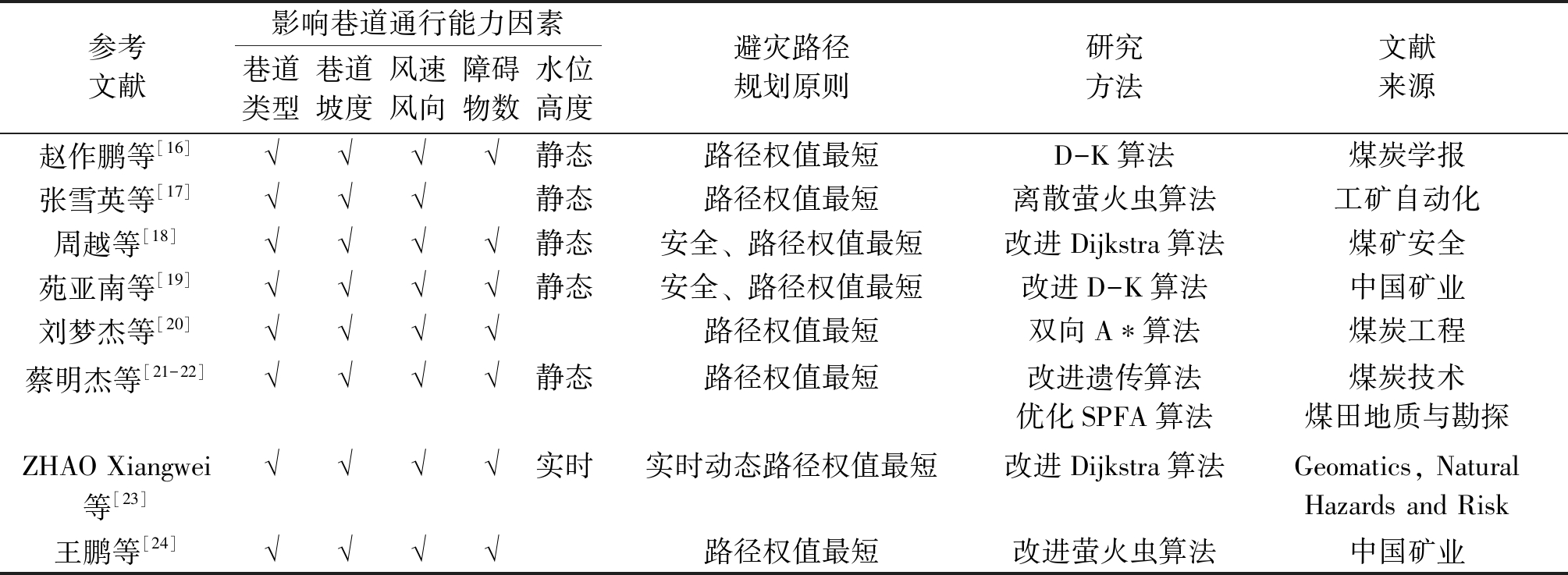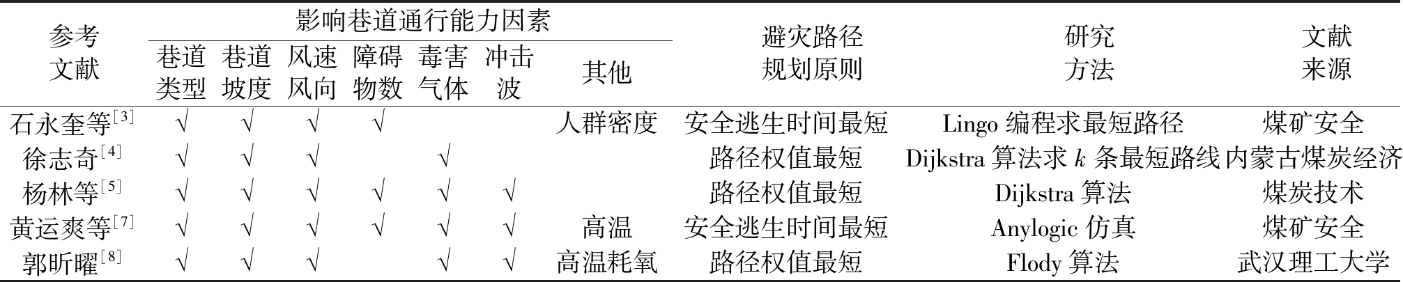 ★ 煤矿安全 ★ 煤矿井下避灾路径规划研究综述煤炭是我国的基础能源和主体能源,“双碳”目标下的煤炭开采已进入深部开采阶段,开采深度的增加将使得开采难度增大,开采环境也将变得复杂多变,极易发生煤矿灾害事故,不仅会给煤矿企业造成巨大经济损失,还会造成重大人员伤亡[1]。通过分析相关典型事故发生的原因,可以发现造成这种情况的主要原因是井下人员未能在第一时间从危险地带撤离到安全区域所致。因此,如何让井下人员在发生灾害之后,选择最优避灾路线,此类研究历经多年仍保持一定的热度。 根据查阅的文献,在煤矿常见的灾害事故中,众多学者对矿井瓦斯爆炸、火灾、水灾3种突发事故发生后的最优避灾路径规划问题进行了较多研究,主要从不同因素对巷道通行能力的影响、最优避灾路径规划模型构建以及求解避灾路径的算法3个方面进行研究。笔者通过梳理煤矿井下避灾路径规划问题的研究进展,分析现有研究可完善的内容,并探讨未来研究的趋势,为解决煤矿事故避灾路径规划问题提供相关参考。 1 瓦斯爆炸事故避灾路径规划1.1 瓦斯爆炸事故特性瓦斯爆炸是威胁我国煤矿安全的极为严重的灾害之一,具有较强的突发性、破坏性,在造成群死群伤的同时,还会破坏通风系统、引起火灾,或是引发多次连续性瓦斯爆炸,造成事故扩大,给避灾路径规划增加了困难[2]。 1.2 研究进展以“瓦斯爆炸避灾路径/路线规划”或“瓦斯爆炸逃生路径/路线规划”为主题在中国知网进行检索,共检索到1998-2018年的24篇文献,具体统计如图1所示。 当前关于瓦斯的研究主要针对瓦斯突出预测及防治、瓦斯爆炸机理及风险评估等方面的研究,而在瓦斯爆炸避灾路径研究方面相对较少,目前学者们所取得的成果有:石永奎等[3]构建以安全逃生时间最短的数学模型,并用Lingo编程求最短路径;徐志奇[4]和杨林等[5]运用Dijkstra算法对巷道当量长度进行计算确定井下人员的最佳避灾路线;贾齐林等[6]针对瓦斯爆炸设计了煤矿紧急避险系统;黄运爽等[7]综合考虑影响工作人员正常通行的因素,将巷道固有影响因素转化为对巷道当量长度的影响,将灾害因素转化为对通行时间影响,以安全逃生时间最短为目标构建避灾模型;郭昕曜[8]通过分析瓦斯爆炸产生的灾害因素,以所选路径权值最短构建人群避灾模型,最后基于Flody算法求解最优避灾路径;芦飞平[9]基于多智能体仿真技术,应用Repast仿真平台构建煤矿事故安全避灾仿真模型,分别在位置选择、方向选择、邻接矩阵和广度优先算法生成不同避灾路线等。笔者主要从影响巷道通行能力因素、避灾路径规划原则、研究方法3个方面总结瓦斯爆炸避灾路径研究代表性文献,见表1。