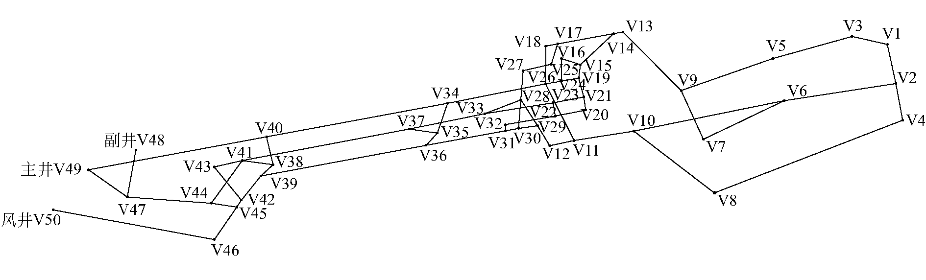 算法参考文献改进措施优势Dijkstra算法文献[4]增加动态调整因子根据受灾情况,实时选择路径文献[28]动态更新时间当量长度动态搜索路径,更具准确性与实用价值蚁群算法文献[29]利用巷道分区特性影响蚂蚁的行为,修改蚁群会合策略和蚁群死亡规则提高蚂蚁的搜索效率和蚁群算法的性能文献[30]利用CO浓度、瓦斯浓度、风量风速、巷道行走难度和人员综合素质各影响因素的量化值更新蚁群算法信息素最优解具有较好的收敛性K则最优路径算法文献[27]添加双向搜索扩大搜索范围,具有较高的准确性和实用性文献[31]引入巷道的等加权因子计算量减少,实现较容易A∗算法文献[20]正反向搜索同时进行扩大搜索范围,选择路径更优文献[32]A∗算法与动态窗口法(DWA)构成融合算法自主规划各种情形的实时路径,具有良好的精准性、一致性、快速性遗传算法文献[21]引入新的交叉、变异算子,适应度函数加入安全通过概率提升了算法的收敛速度和可靠性文献[33]根据路径长度最短且能耗最少设计适应度函数解决了传统遗传算法“早熟现象”和“收敛速度慢”的问题粒子群算法文献[34]利用粒子群算法搜索蚁群算法参数 , , ,再反馈到蚁群算法中缩短搜索路径时间,全局搜索能力较好文献[35]将粒子群独立分布在不同容器中分别进行路径建模路径规划时间降低,规划的最优路径准确率较高D-K算法文献[16]Dijkstra算法与K则最优路径算法结合求解从源节点到其他所有逃生节点的前N条最优路径文献[19]提前剔除危险度较大巷道缩小搜索范围,提高搜索效率SPFA算法文献[22]优化算法松弛过程同时搜索到达巷道中某一点的多条路线,效率更高萤火虫算法文献[24]引入考虑逃生巷道干扰因素的当量长度,调整搜索策略具有较好的收敛性、稳定性,大范围搜索优化的能力强 5 案例应用结合以上3种事故类型的研究,笔者以矿井水灾为背景,研究五沟煤矿1035工作面避灾路径规划。由于井下环境具有特殊性,含有多种阻碍矿工通行的因素,一般用巷道当量长度来表示巷道中两点之间的距离。结合该矿井的巷道环境以及现场模拟分析,选取巷道类型、巷道坡度、风速风向、局部障碍物(带式输送机、轨道、风桥、风门等设施)数量以及水位高度,作为影响井下矿工逃生的主要影响因素,其影响系数分别记为ηt、ηs、ηv、ηr、ηw,影响巷道通行难易系数可以查阅文献[16]。 假设节点Vi和Vj间巷道Eij的实际长度为l(Eij),将巷道的各因素影响系数加权到其对应的实际长度中,得到该条巷道初始当量长度值L(Eij)为: (1) 式中:n——巷道Eij上障碍物数量; ηrm——第m个局部通行障碍物影响巷道正常通行的系数。 以五沟煤矿1035工作面实际巷道布置图为基础,简化其节点,选出50个关键节点形成巷道网络图进行案例分析,1035工作面巷道网络如图5所示,其中V48、V49、V50是该矿井的井口,将这3个节点设为安全节点。根据该矿井水文地质资料、采掘工程资料得知V1易发生突水,所以将节点V1设为突水点。 假设V1突水点的水位高度达到普通成人膝盖处的高度,首先根据该工作面实际巷道环境情况,计算每条巷道的各个影响系数值,然后根据式(1)计算出每条巷道的当量长度,见表5(限于篇幅只列举部分数据)。 最后基于Python平台,使用Dijkstra算法分别计算突水点V1到3个安全节点V48、V49、V50的最短路径,然后对这3条路径按照路径当量长度从小到大排序,结果见表6。