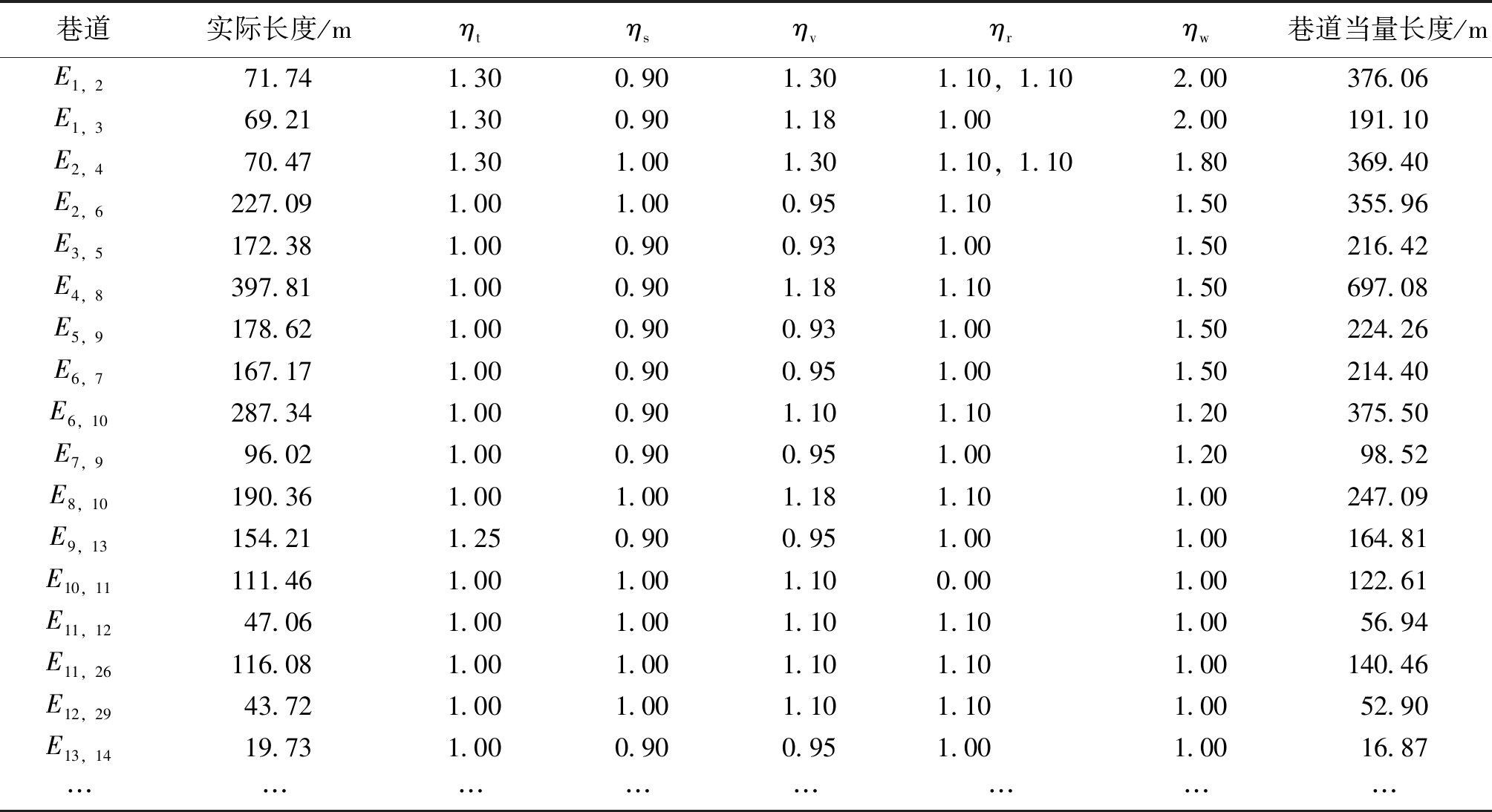 巷道实际长度/mηtηsηvηrηw巷道当量长度/mE1,271.741.300.901.301.10,1.102.00376.06E1,369.211.300.901.181.002.00191.10E2,470.471.301.001.301.10,1.101.80369.40E2,6227.091.001.000.951.101.50355.96E3,5172.381.000.900.931.001.50216.42E4,8397.811.000.901.181.101.50697.08E5,9178.621.000.900.931.001.50224.26E6,7167.171.000.900.951.001.50214.40E6,10287.341.000.901.101.101.20375.50E7,996.021.000.900.951.001.2098.52E8,10190.361.001.001.181.101.00247.09E9,13154.211.250.900.951.001.00164.81E10,11111.461.001.001.100.001.00122.61E11,1247.061.001.001.101.101.0056.94E11,26116.081.001.001.101.101.00140.46E12,2943.721.001.001.101.101.0052.90E13,1419.731.000.900.951.001.0016.87…………………… 表6 Dijkstra算法的仿真结果