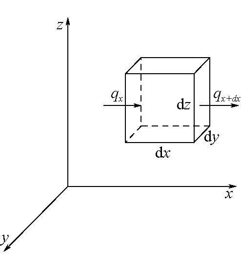 图1 半无限介质计算坐标 半无限大介质中的汞迁移现象属于一维现象,根据费克扩散定理和达西定理,介质中汞浓度分布的方程可以表示为: (1) 式中:c——介质中汞浓度,ng/m3; D——汞在介质中的扩散系数,m/s3; v——介质中的渗流速度,m/s; η——孔隙度,孔隙度表示土壤的孔隙空间体积与土壤的外表体积的比值,%。 式(1)中边界条件为x=0,c=c0;x=∞,c有界。方程的解: 式(2)说明在半无限空间中汞浓度符合指数分布规律,而且与汞的扩散系数、孔隙度、渗流速度有关。 1.1 温度影响下的汞传递过程把自燃的煤看作一个微元体,如图2所示。在单位时间内从微元体左侧dydz流入的热能为qxdydz,经右界面流出的热能为qx+dxdydz,则流入的净热能为(qx-qx+dx)dydz。固体在热传输时符合傅里叶定理,则热能可以表示为: (3) 式中:qx——微元体流入x方向的热能,J; λ——稀松煤体在x方向上的导热能系数,W /(m· ℃);