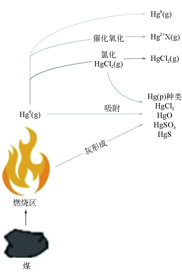 (9) 上述各个公式从传热传质学角度阐述了汞在温度影响下的迁移机理,汞在高温加热下会转换成气态汞。通过汞分析测定煤田火区地表气态汞浓度,火区燃烧越剧烈对应地表裂隙或煤田火区探测孔(观测孔)的气态汞浓度越大,从而判定火区高温异常区域。 1.2 煤中汞的迁移机理煤燃烧排放到大气环境中的汞有3种价态存在:Hg0、Hg2+和Hgp。汞的迁移转化过程如图3所示。煤燃烧后释放出的气态汞以气态形式释放出来;在催化氧化作用下形成汞化合物;在氯化作用下形成汞的氯化物;在吸附作用下形成汞的p价化合物[5-6]。