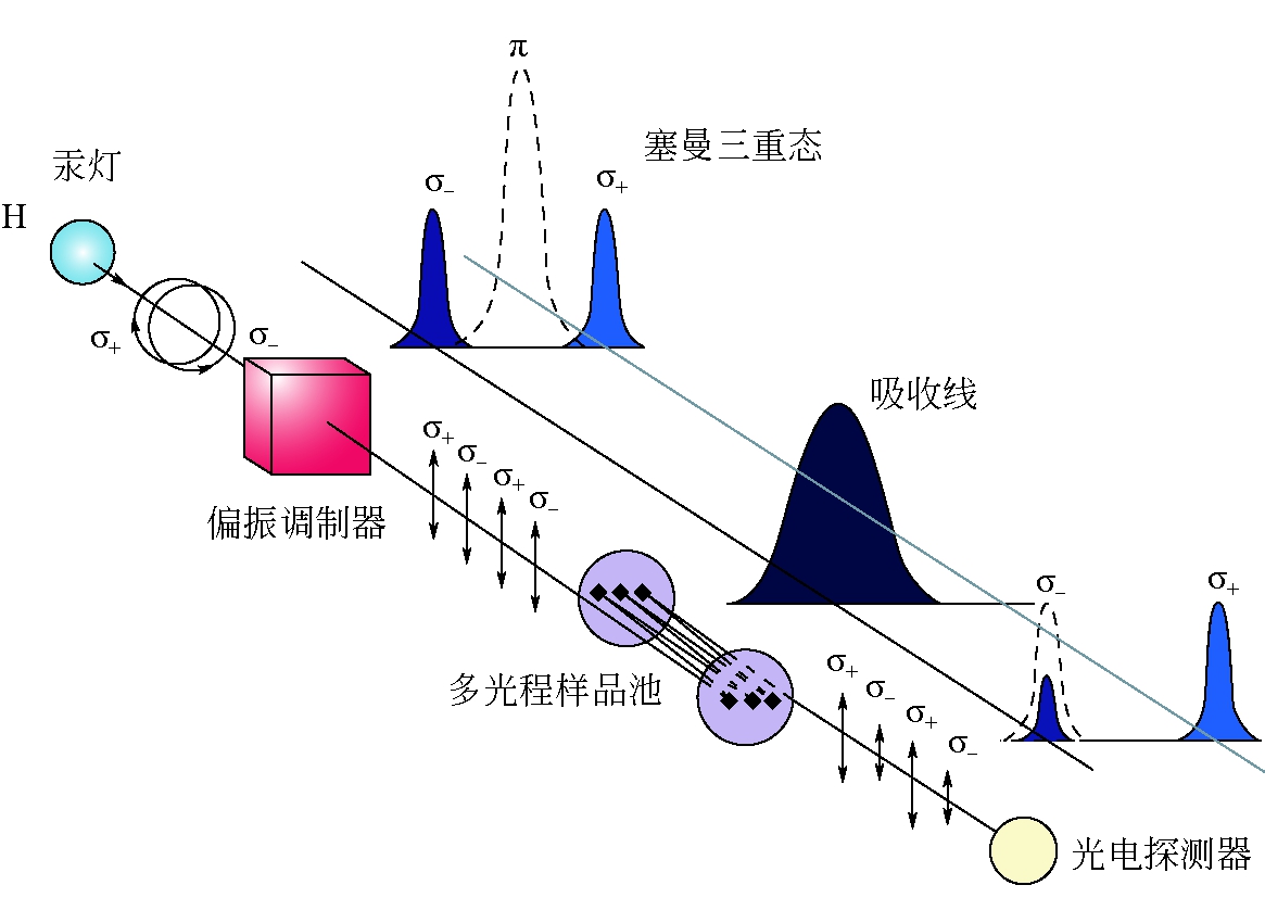 图3 汞的迁移过程 2 测试仪器原理RA-915M汞分析仪应用高频调制的塞曼原子接收光谱技术,可以直接测定大气中汞含量,其操作原理如图4所示。光源(汞灯)置入恒磁体H内,汞的共振线λ、σ-、σ+、π可配备不同模块,实现固、液、气多种样品检测,汞的共振线λ=254 mm破裂成3个极化的塞曼组分(π、σ-、σ+)[7]。当光线沿磁场方向传播时,只有σ组分进入检测器[7]。其中σ-能够进入样品池,而σ+在样品池外通过。σ-与σ+组分差值与汞蒸气浓度呈正比例。RA-915M汞分析仪可以在实验室和室外使用,可实时监测钻孔中汞浓度。该仪器每秒获得1个数据,每10 s获得1个平均值,每个钻孔测试3 min[8-12]。 3 现场应用3.1 10号火区概况10号火区位于五虎山煤田西南,面积约504.1 km2,主要燃烧1号、2号、4号、6号和7号煤层。10号火区分为3个区域,分别为火I区域、火II区域、火III区域,如图5所示,10号火区下部正在开采011203工作面,011203工作面开采12号煤层,10号火区与011203工作垂直距离约130 m,10号火区燃烧的7号煤层距离011203工作面垂直距离约95 m,因此及时探测10号火区高温区域是非常必要的。项目组对10号火区进行了红外热成像扫描,如图6所示。通过对10号火区进行红外成像扫描,初步判断火区高温区域,对高温区域进行气态汞浓度测定,提高了火区的探测效率。