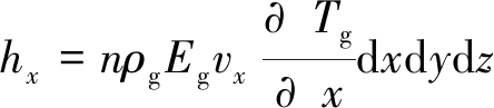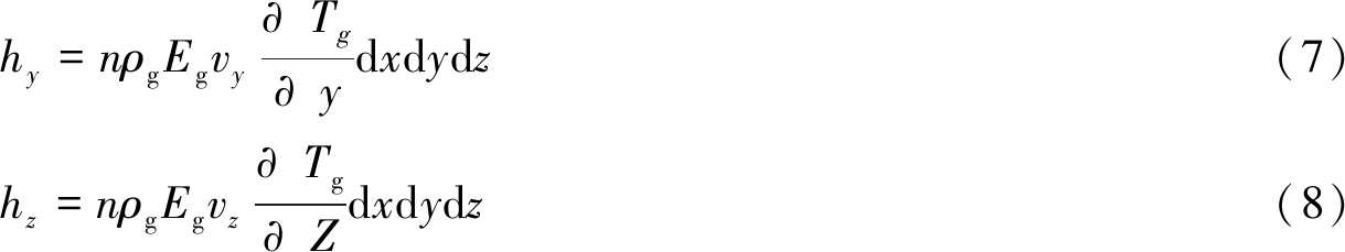 式(3)减去式(4)得到沿x方向净流量: (5) 同理可以得到y方向和z方向的净流量,分别为 (6) 式中:n——松散煤体的空隙率,%; ρg——空气密度,g/cm3; Eg——比热,J/(g·℃); vx——风流在x方向上的流速,cm/s; Tg——空气的温度,℃。 同理在y、z方向的热焓值分别为: