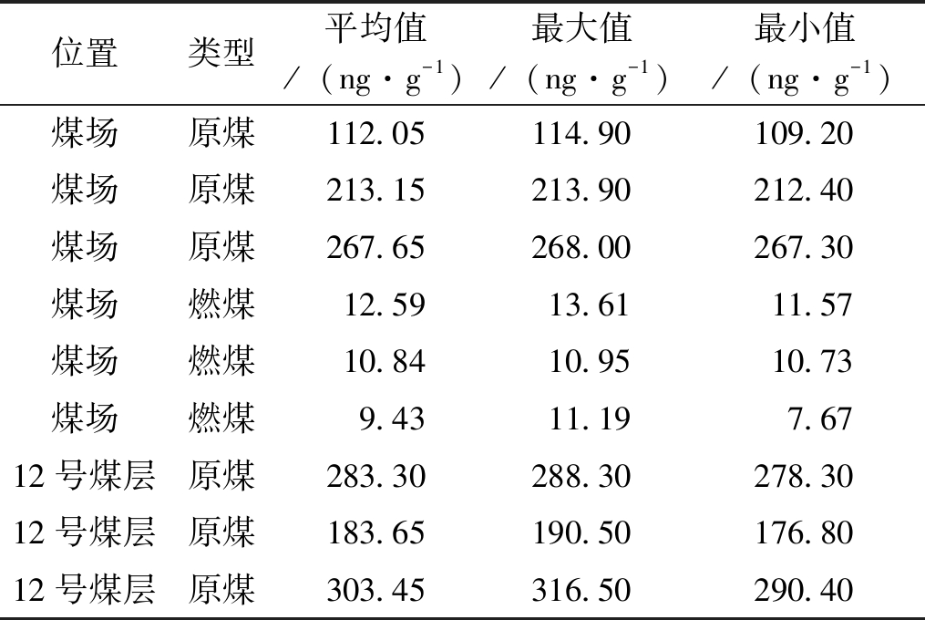 位置类型平均值/(ng·g-1)最大值/(ng·g-1)最小值/(ng·g-1)煤场原煤112.05114.90109.20煤场原煤213.15213.90212.40煤场原煤267.65268.00267.30煤场燃煤12.5913.6111.57煤场燃煤10.8410.9510.73煤场燃煤9.4311.197.6712号煤层原煤283.30288.30278.3012号煤层原煤183.65190.50176.8012号煤层原煤303.45316.50290.40 表2 10号火区汞浓度测试数据