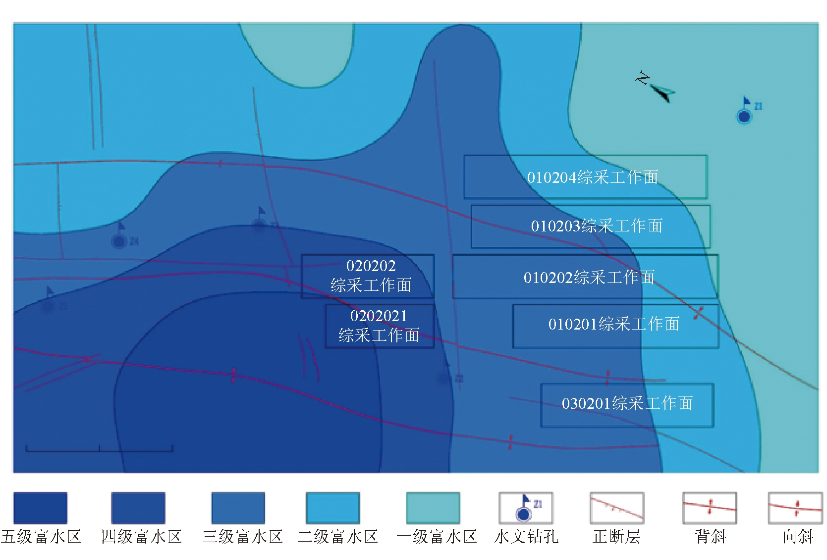 (5) 式中:B——评判对象的综合评判结果; A——n个参与模糊综合评判因素的权重; R——模糊综合评判矩阵。 由于加权平均型算子对所有因素权重大小均衡兼顾,因此,在这里采用了加权平均算子。 2.1.4 现场应用 利用模糊综合评判结果,绘制红柳煤矿首采区直罗组下段含水层富水性分区,如图3所示。