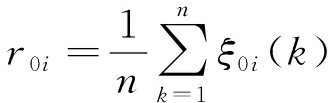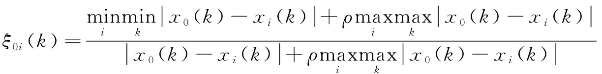 图2 基于地质勘探钻孔水文信息 2.1.3 含水层富水性分区步骤 (1)各评价指标与钻孔单位涌水量的关联度计算。灰色关联分析的具体计算步骤如下:设参考数列为:x0={x0(k)|k=1,2,…j},各水文孔的单位涌水量为参考数列;设比较数列为:x1={x1(k)|k=1,2,…j},x2={x2(k)|k=1,2,…j},…,xi={xi(k)|k=1,2,…j},含水层砂地比、含水层厚度、粗砂岩厚度、粗砂岩层数、断层分维值和褶皱分维值为比较数列。 关联系数表达式如下: