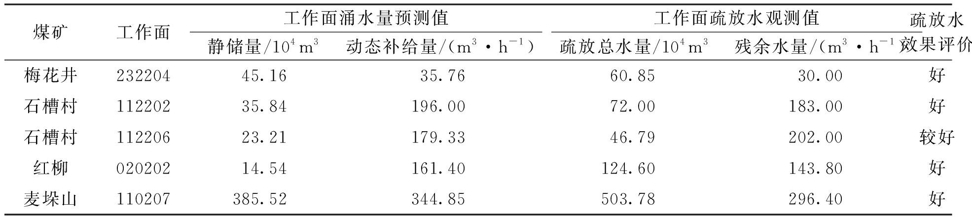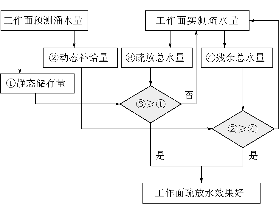 图4 麦垛山煤矿11采区涌水量预测曲线 2.3 工作面顶板水害威胁程度定量化评价2.3.1 工作面顶板含水层疏放水效果评价存在的问题 以往对工作面受底板灰岩水害威胁程度通常采用突水系数法,底板受构造破坏的地段突水系数一般不得大于0.06 MPa/m,隔水层完整无断裂构造破坏的地段不得大于0.10 MPa/m。由于突水系数简单易用,是评价工作面底板水害威胁程度的常用定量化方法。 受顶板砂岩水害威胁的工作面常采用顶板水疏放的防治水方法,但是由于缺少顶板水疏放效果定量化评价方法,一方面在未达到疏放水效果的情况下盲目开采会导致工作面涌水量较大,甚至发生水害事故,另一方面在达到疏放水效果时继续对顶板含水层进行疏放,不仅破坏了地下水资源,同时还使矿井涌水量增大,对矿区周边生态环境造成不良影响。 2.3.2 工作面顶板含水层疏放水效果定量化评价 基于受顶板水害威胁工作面的涌水量组成分析,影响和威胁工作面安全回采的主要为顶板含水层的静储量,这部分水量如果未经疏放,在工作面回采时会经过导水裂缝带进入采空区,导致涌水量增大。工作面回采时顶板含水层的动态补给量在短时间内是无法疏干的,配备满足要求的排水系统即可。 建立“双因素四指标”疏放水效果评价方法:工作面疏放总水量大于等于静态储存量,并且疏放水残余总水量小于等于动态补给量时,可以判断工作面顶板含水层的静态储存量得到了充分疏放,利用工作面疏放水观测值和涌水量预测值双因素中的静态储存量、动态补给量、疏放总水量和残余总水量4个指标进行比对,实现了对顶板水疏放效果的定量化评价[15],评价流程如图5所示。