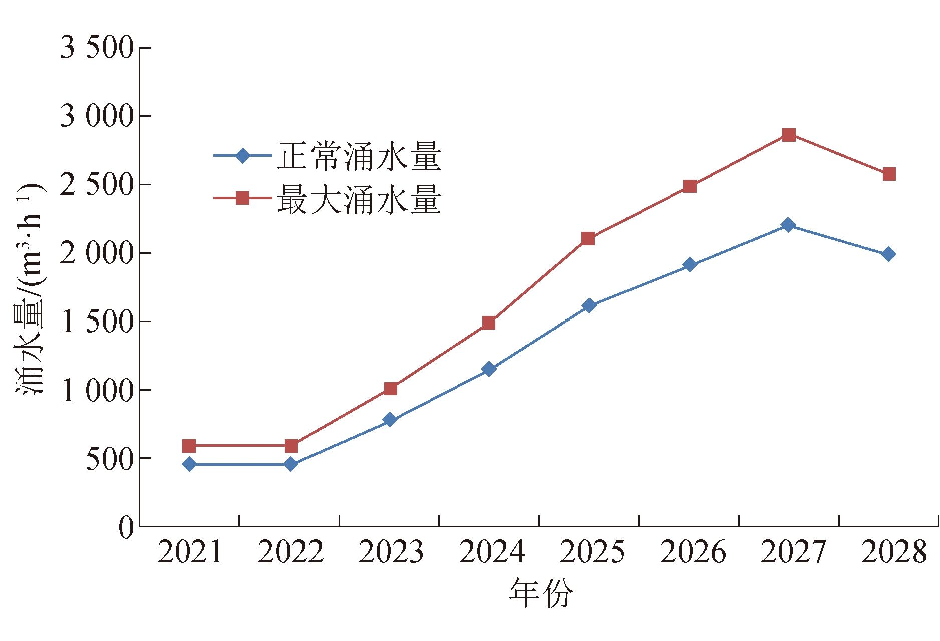 图3 红柳煤矿首采区直罗组下段含水层富水性分区 根据对研究区内各工作面涌水量的观测台账,位于五级和四级富水性的工作面涌水量明显大于位于三级和二级富水区的工作面,基于地质勘探钻孔水文信息的含水层富水性分区结果与实际井下工作面涌水量较为一致。 2.2 工作面与矿井涌水量动态预测2.2.1 工作面与矿井涌水量预测存在的问题 以往针对鸳鸯湖矿区工作面涌水量预测主要采用大井法或集水廊道法,其预测值通常比实际值小,通过分析工作面顶板充水含水层水文地质特征,认为工作面顶板直罗组下段砂岩含水层以孔隙为主,裂隙发育,地下水主要为古封存水,加之鸳鸯湖矿区构造发育,含水层平面上被断层切割,连通性较差,以静储量为主。采用大井法或集水廊道法计算的涌水量仅是工作面的动态补给量,而忽视了顶板含水层的静储量。 以往预测矿井涌水量时,通常将整个预测区域作为大井或集水廊道,所得到的涌水量预测值为固定值,不能实时指导各采区或矿井排水系统的建立。而矿井涌水量实际上是一个随着采掘空间和时间变化的动态值。 2.2.2 静储量结合动态补给量的工作面涌水量预测 基于以上分析,提出了静储量叠加动态补给量的“动静结合”工作面涌水量预测方法,工作面涌水量包含垮落带周边的侧向动态补给水量和垮落带内含水层的静储量,使工作面涌水量预测结果更加符合实际。 (1)静储量预测。静态储存量主要是指当煤层回采产生的导水裂缝带影响范围内的含水层由于重力作用而释放出来的水量,计算式如下: Q静=LB1Mμ (6) 式中:Q静——含水层的静储量,m3/h; L——工作面走向长度,m; B1——垮落区宽度,m; M——含水层厚度,m; μ——含水层的给水度。 (2)动态补给量预测。对于工作面动态补给量的预测可以采用“大井法”,其计算式如下: Q动 (7) 式中:Q动——工作面动态补给量,m3/h; K——含水层的渗透系数,m/d; H——水头高度,m; R0——引用影响半径,m; r0——引用半径,m。 也可以采用集水廊道法,其计算式如下: Q动 (8) 式中:c——巷道底板周长,m; R1——影响半径,m。 (3)工作面涌水量预测。工作面涌水量由顶板含水层的静储量和动态补给量组成,计算式如下: Q工=Q静+Q动 (9) 2.2.3 基于时空分区的矿井涌水量预测 为了使矿井涌水量能够实时指导防治水工作和排水系统的设置,提出了基于时空分区的矿井涌水量预测方法,即根据矿井采掘接续计划将预测期划分为若干时段,再分别预测各时段内各分区(工作面或巷道)的涌水量,最终得到一个随时间变化的矿井涌水量动态预测值[14],计算式如下: (10) i=1,2,3…m;j=1,2,3…n 式中:Qi——第i时段矿井涌水量,m3/h; qij——第i时段j处涌水量,m3/h。 基于时空分区的矿井涌水量也可以用于采区或不同水平涌水量预测。 2.2.4 现场应用 麦垛山煤矿11采区是2号煤层首采区,为了给防治水工作和排水系统建立提供依据,需要对11采区进行涌水量预测。根据11采区2021-2028年采掘接续方案,将预测期按照年度划分为8个时间段,分别对各时间段内不同工作面涌水量进行预测,最终得到11采区涌水量动态预测值,如图4所示。