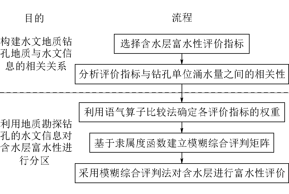 煤矿平均厚度/m单位涌水量/(L·s-1·m-1)渗透系数/(m·d-1)清水营47.780.009 90.009 6梅花井46.140.033 20.047 5石槽村67.780.058 00.059 4红柳68.990.060 50.077 4麦垛山100.700.148 70.301 6 1.2.2 隔水层 研究区隔水层包括古近系清水营组、侏罗系安定组、直罗组、延安组煤层顶底板隔水层,岩性主要为泥岩、粉砂岩和砂质泥岩。 1.2.3 地下水补径排 潜水含水层地下水主要接受大气降水补给,沿地势由高向低径流,在沟谷洼地以泉的形式排出,还有一部分越流补给承压含水层;承压含水层地下水主要接受露头区大气降水补给、潜水含水层的越流补给,径流方向大致与潜水含水层保持一致,最终以矿井排水的形式排出。 2 鸳鸯湖矿区顶板水害防控技术与应用2.1 顶板含水层富水性分区2.1.1 含水层富水性分区存在的问题 钻孔单位涌水量是含水层富水性评价的唯一直接指标,主要是根据抽水试验得到的。研究区各矿井在水文补勘阶段均施工了水文地质钻孔,在抽水试验后留设为地下水位长观孔,为了避免受到采掘活动的影响和破坏,水文地质钻孔一般位于采区边界外的保护煤柱内,但是对矿井防治水工作具有指导意义的却是采区内煤层顶板含水层富水性条件,怎样利用采区外水文地质钻孔的信息评价采区内的煤层顶板含水层富水性是需要解决的重要问题。通常井田范围内地质勘探钻孔较多,而水文地质钻孔较少,怎样有效利用大量地质勘探钻孔的水文信息对含水层富水性进行评价也是防治水面临的主要问题。 2.1.2 含水层富水性分区思路 建立采区外水文地质钻孔与采区内地质勘探钻孔的水文信息相关关系,进而利用地质勘探钻孔的水文信息对采区内含水层进行富水性分区成为首选思路。基于以上思路,提出了基于地质勘探钻孔水文信息的含水层富水性分区技术,即选取与含水层富水性相关性较强的评价指标,然后利用灰色关联度、语气算子比较法、隶属度函数和模糊综合评判法对煤层顶板含水层富水性进行分区[13]。基于地质勘探钻孔水文信息的含水层富水性分区流程如图2所示。