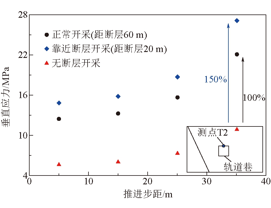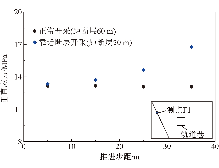 图5 不同工况巷道顶板垂直应力(测点T2)变化 由图4和图5可以得出以下结论: (1)相比无断层开采条件,工作面距离断层60 m和20 m两种工况下巷道顶板垂直应力明显增加,测点T2处垂直应力分别增加了100%和150%,且距离断层越近,顶板围岩垂直应力越大,且高应力范围分布也越广; (2)工作面靠近断层时,采动应力与断层构造应力将产生叠加,容易引起断层滑移、偏转等,诱发冲击事故。 2.4 地堑区开采断层诱冲机制为分析工作面回采过程中两侧断层面附近应力变化特征,以测点F1为例分析应力值变化情况。不同工况下断层面F1测点垂直应力值变化如图6所示。