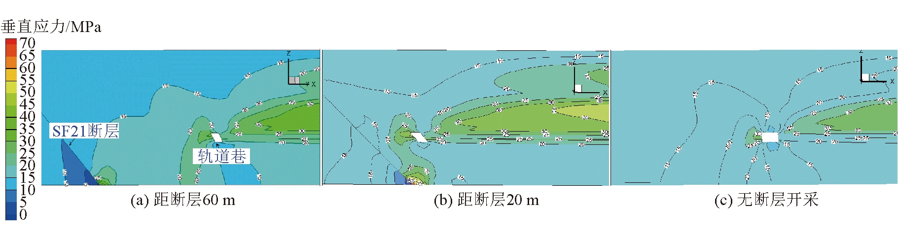 图3 断面上各监测点分布 为了便于直观分析本工作面回采过程中的冲击危险性,同时建立了无断层开采及靠近断层开采(工作面距离SF21断层20 m)的2种数值模型,对比分析3种开采工况不同推进步距下的巷道围岩应力分布规律及断层带上应力变化情况。 2.3 地堑区开采围岩应力分布规律以y=35 m断面为例,给出了开挖35 m条件下正常开采(距断层60 m)、靠近断层开采(距断层20 m)和无断层开采3种工况巷道围岩垂直应力分布规律。 同工况下巷道围岩垂直应力云图如图4所示,不同工况巷道顶板垂直应力(测点T2)变化如图5所示。